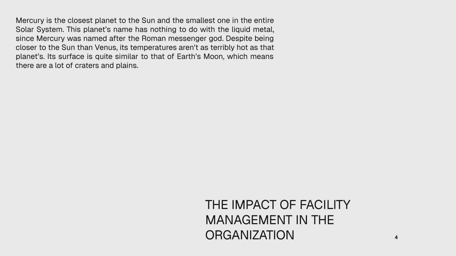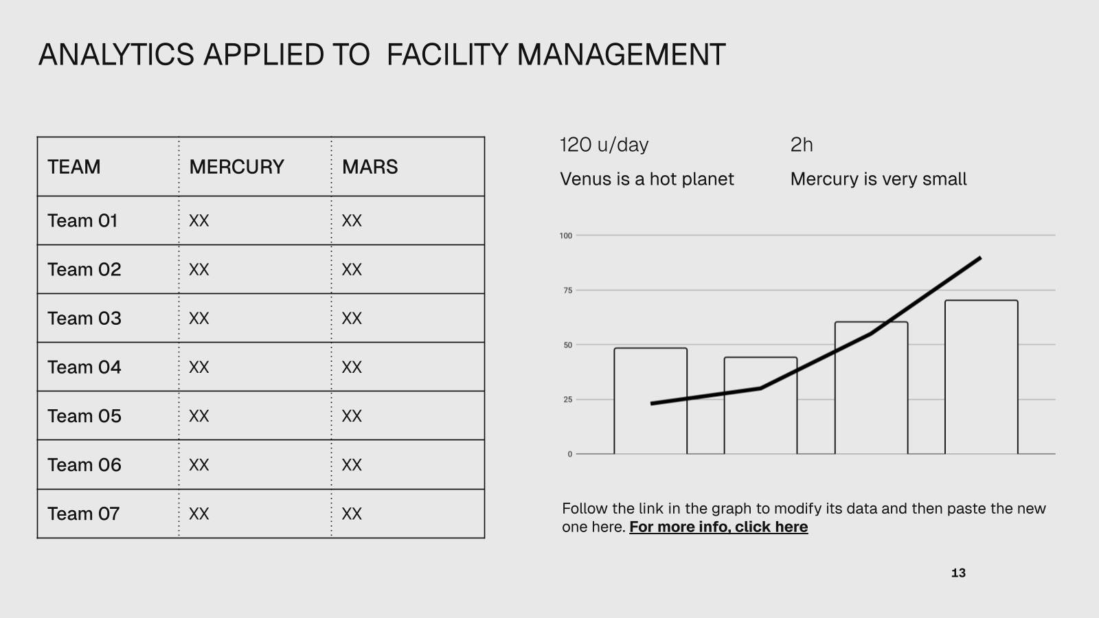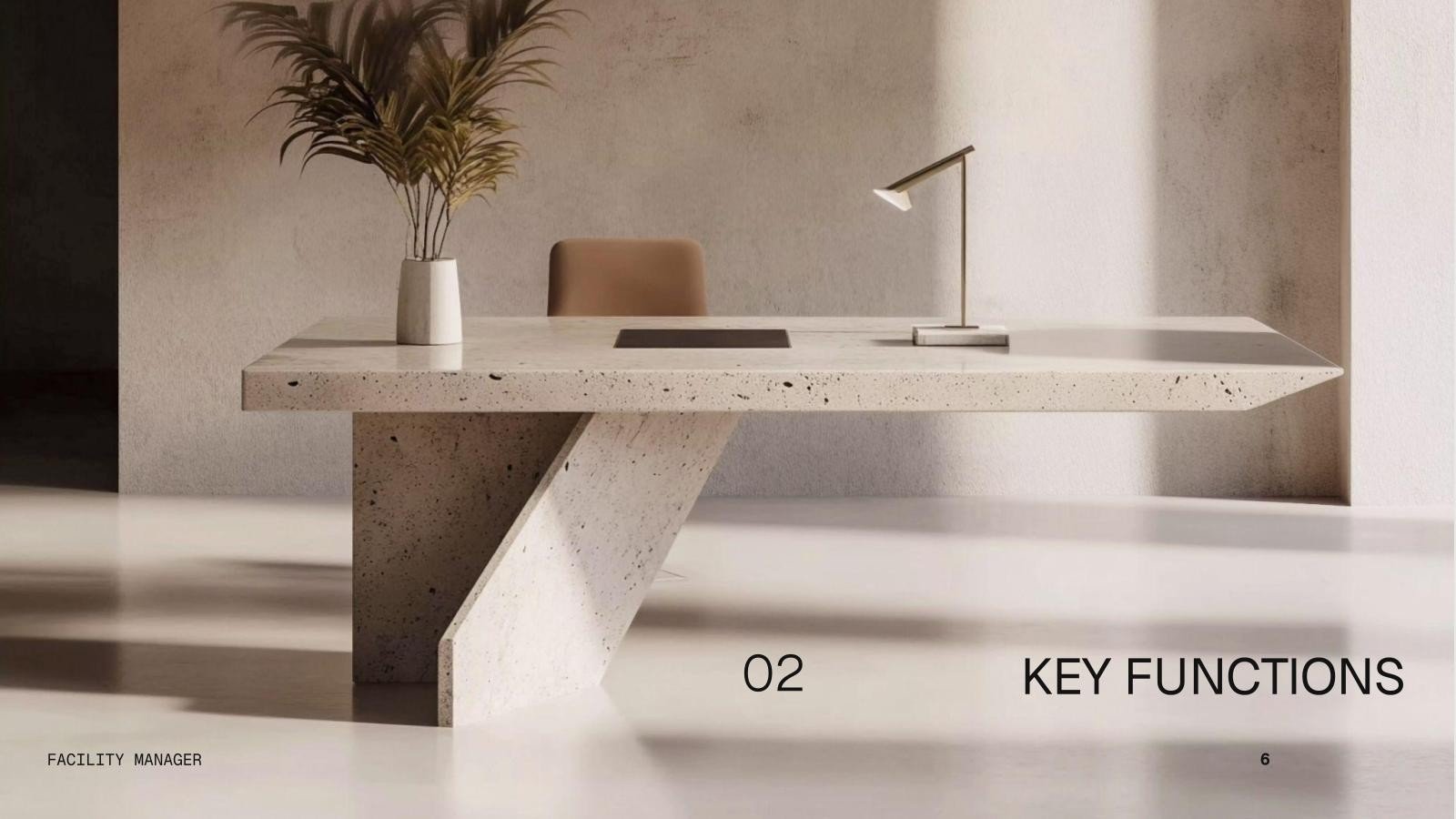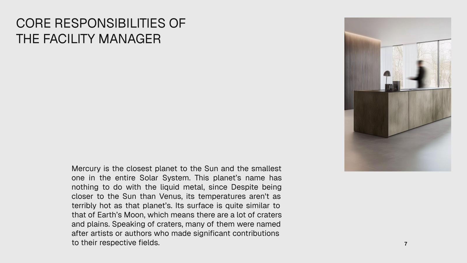 “下载设施管理演示文稿,用于PowerPoint或Google幻灯片。准确有效地传达你的商业计划是任何成功创业的基石。该模板允许您精准指出运营的关键要素,同时受众也会欣赏清晰简洁的呈现,消除潜在的误解。这不仅仅是内容,我们的设计同样吸引目光!你的商业计划肯定会给你留下积极印象。”