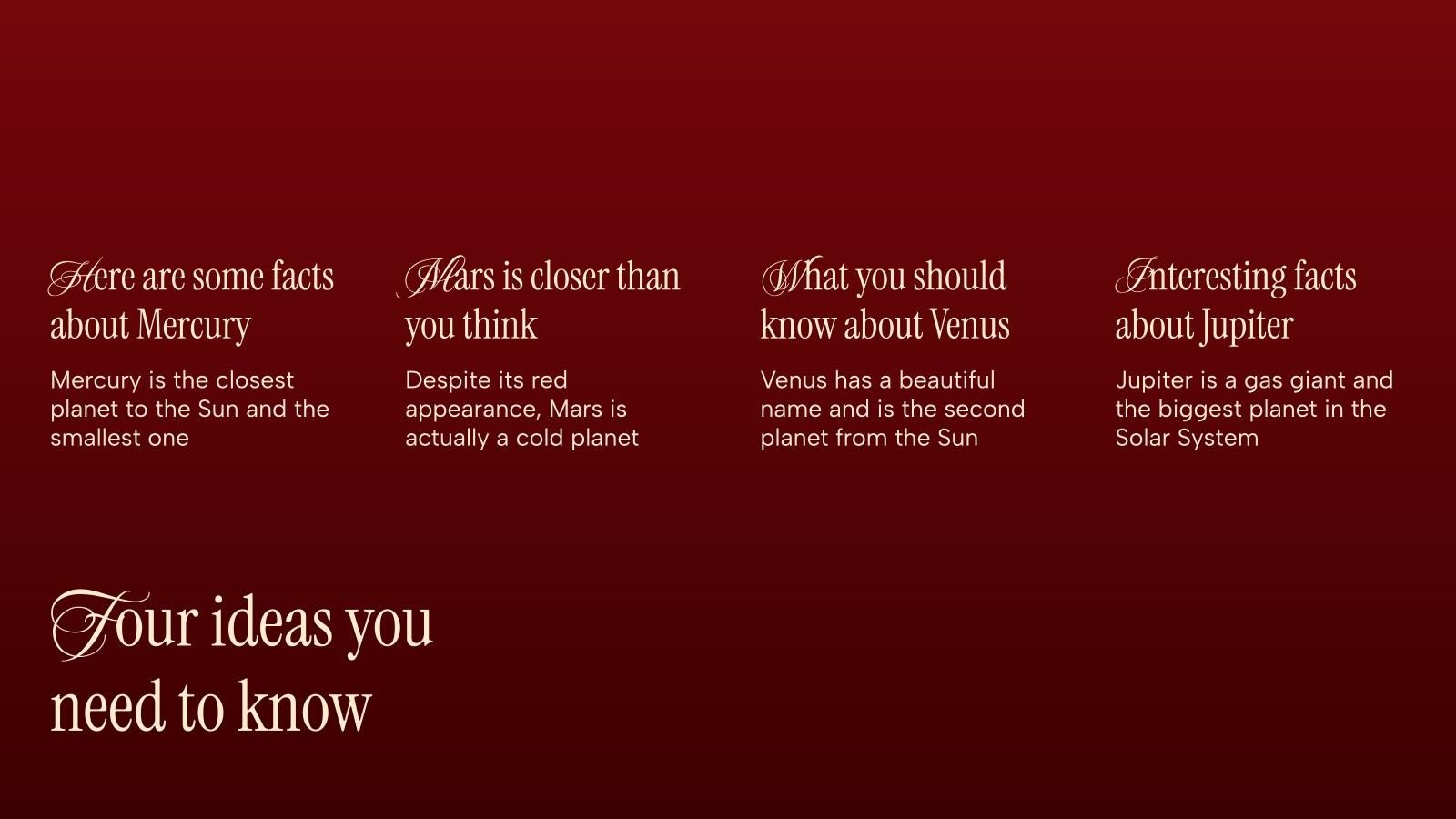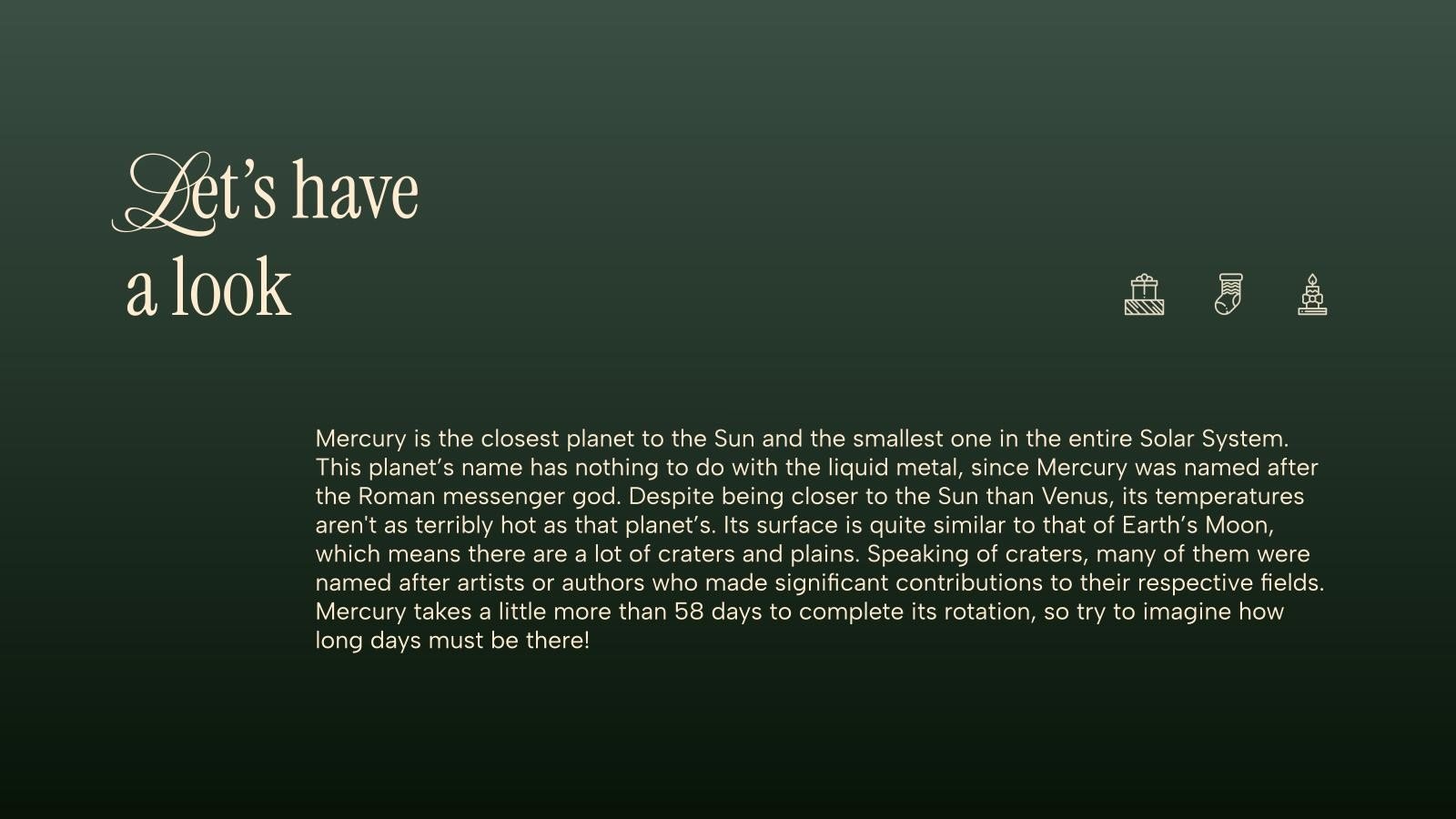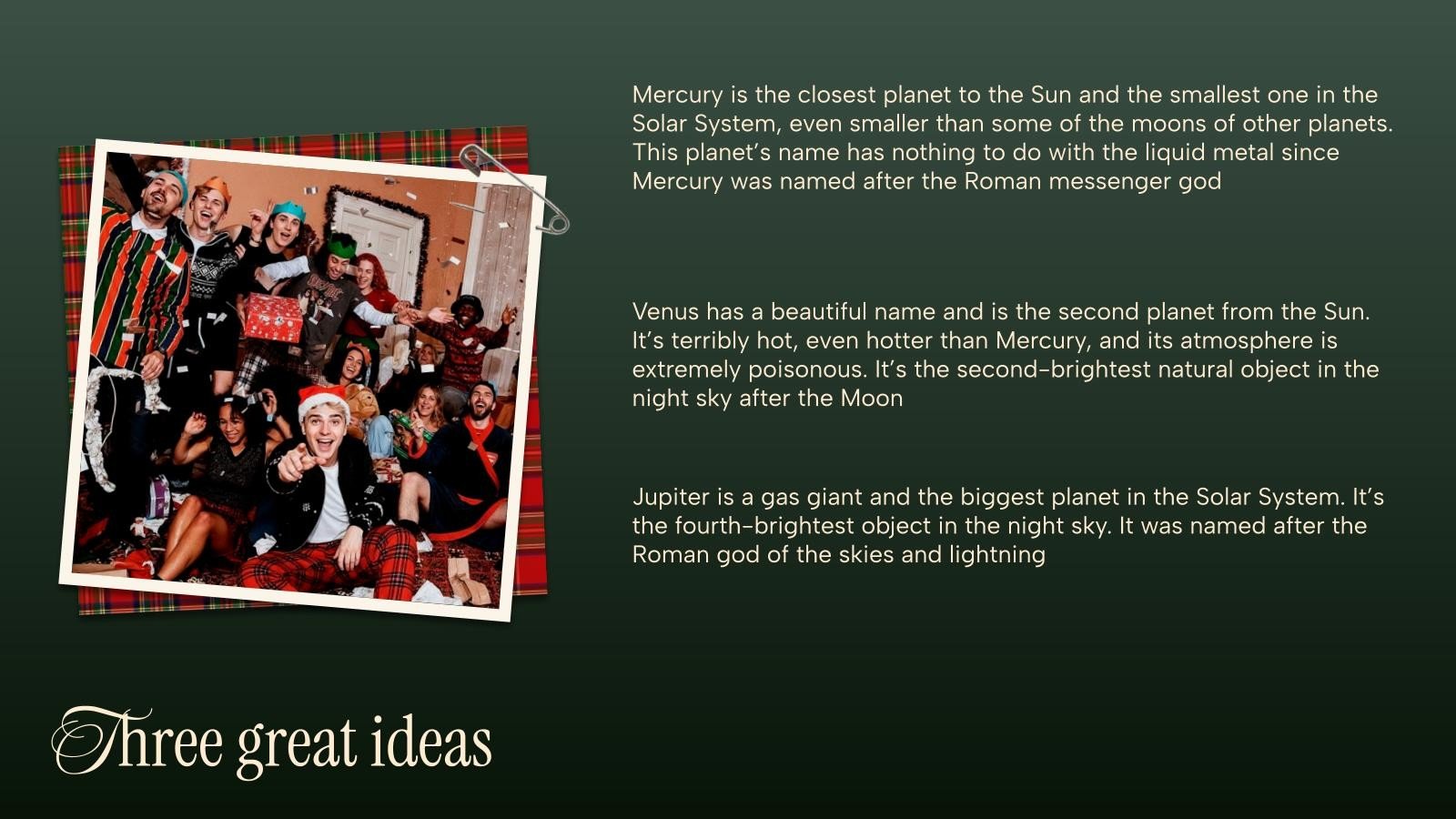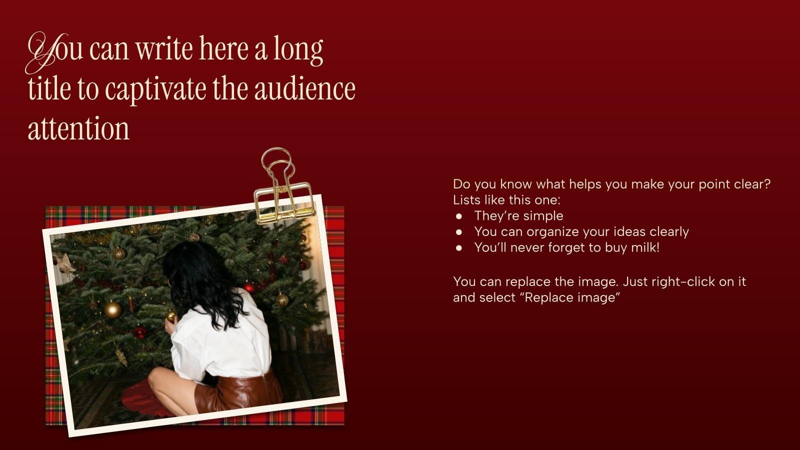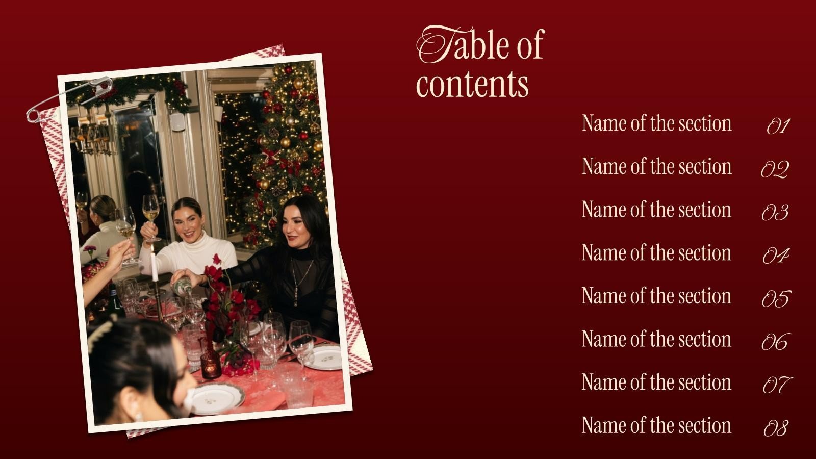 “下载圣诞夜聚会演示文稿,支持PowerPoint或Google幻灯片,开始用创意和原创的设计打动你的观众。像这里这样的幻灯片模板,可以通过不同的图形资源,以清晰、简洁和直观的方式传达一个概念、想法或主题。你需要谈论一个具体话题,但你不知道怎么说?试试用像这里这样的演示,百分之百可定制!”