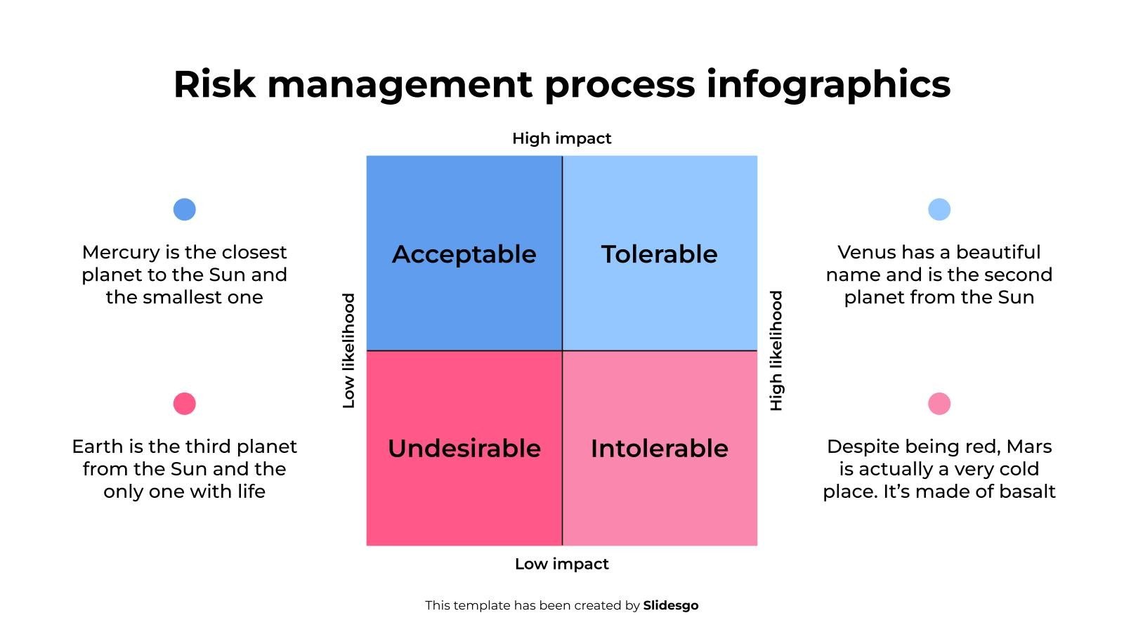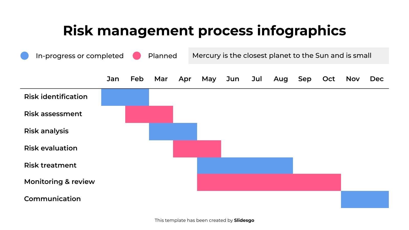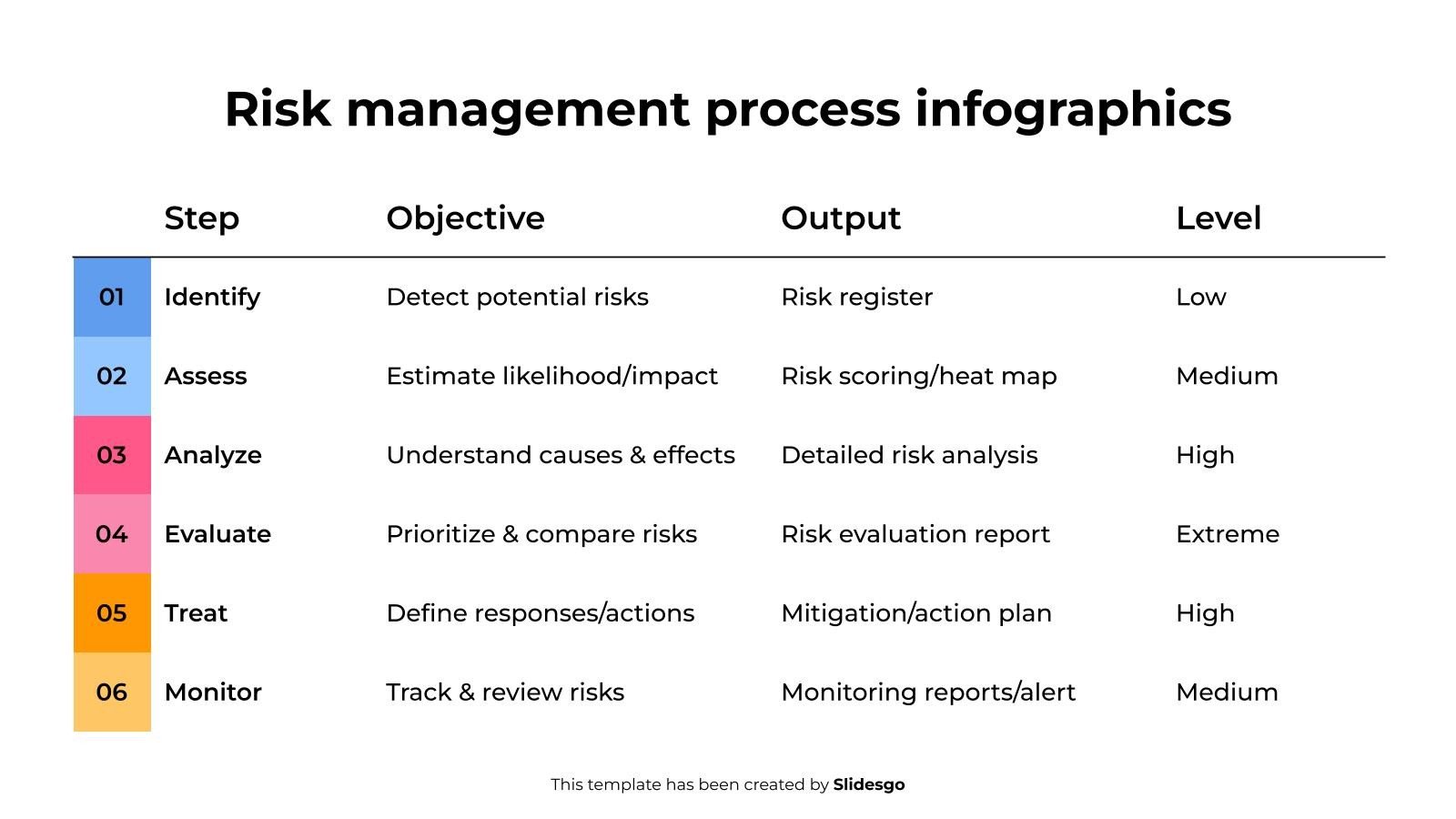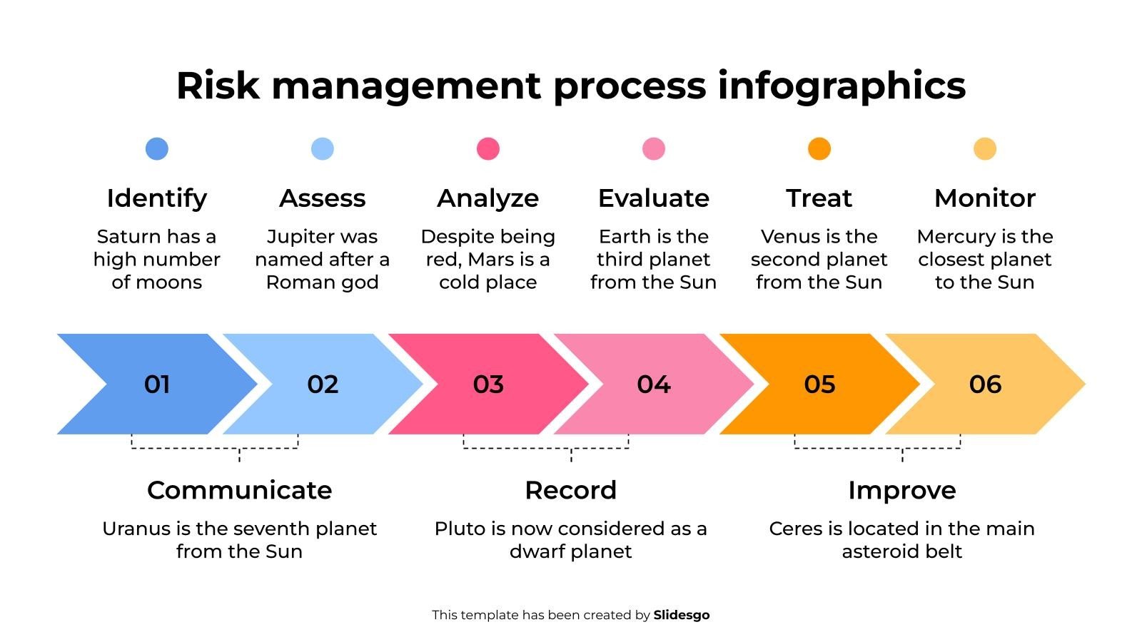 下载适用于 PowerPoint 或 Google 幻灯片的风险管理流程信息图表模板,以充分利用信息图表。无论您是想在表格中组织您的业务预算,还是想示意性地分析您过去一年的销售额,这套信息图表资源都将有很大帮助。立即开始使用信息图表,将您的业务或营销演示提升到一个新的水平。