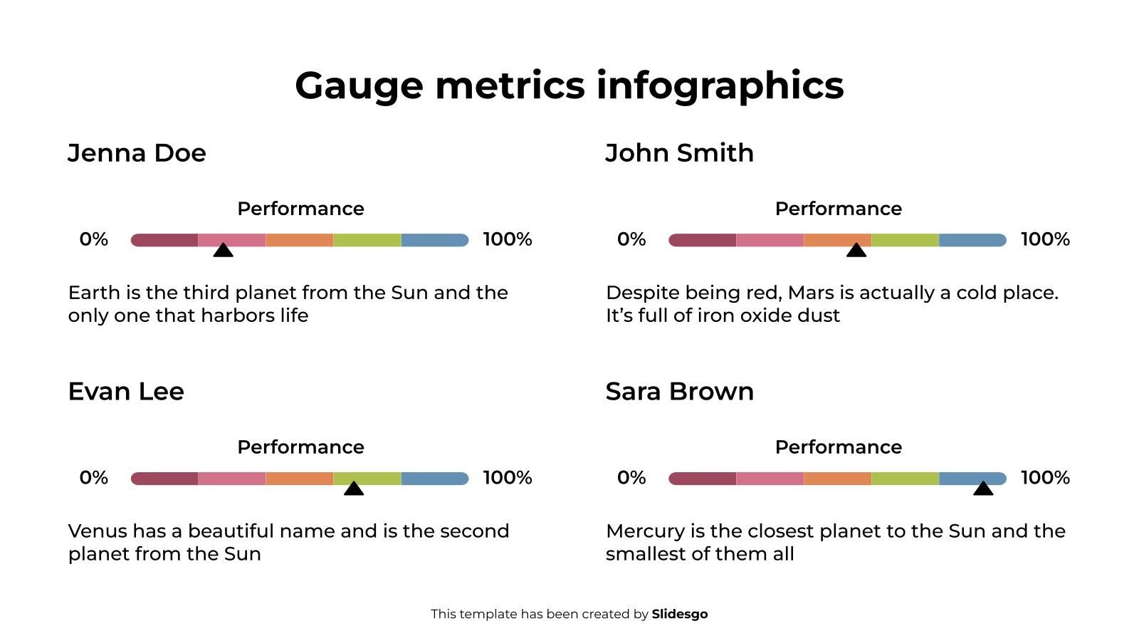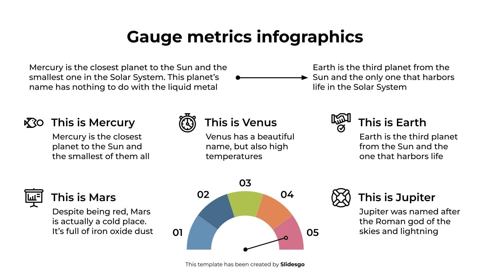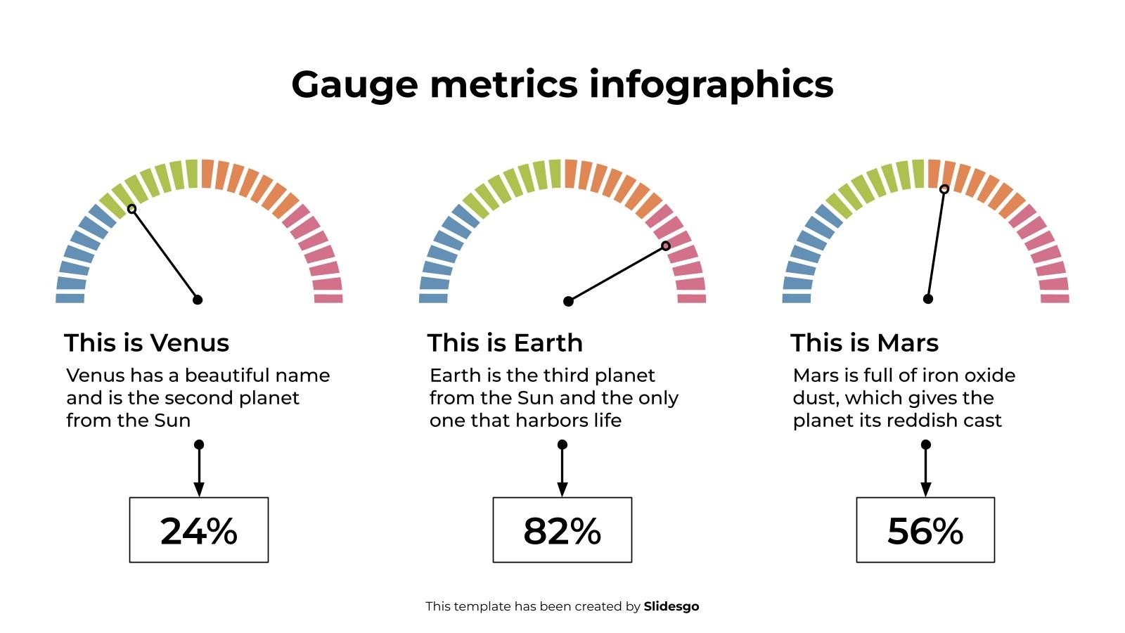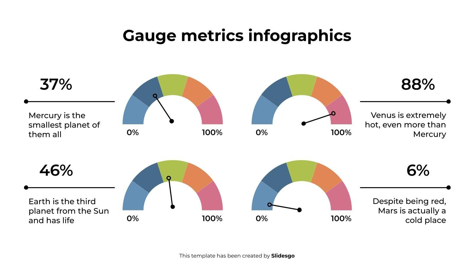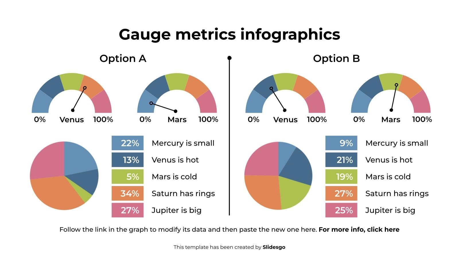下载适用于 PowerPoint 或 Google 幻灯片的 Gauge Metrics 信息图表模板,以充分利用信息图表。无论您是想在表格中组织您的业务预算,还是想示意性地分析您过去一年的销售额,这套信息图表资源都将有很大帮助。立即开始使用信息图表,将您的业务或营销演示提升到一个新的水平。