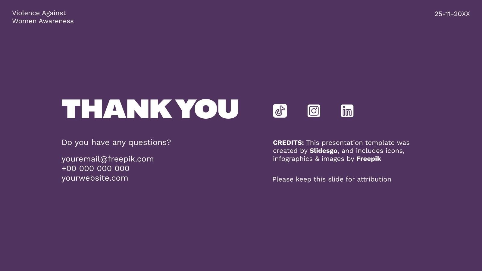 “下载 PowerPoint 或 Google 幻灯片的暴力侵害妇女意识日演示文稿,开始用创意和原创设计给观众留下深刻印象。像这里这样的 Slidesgo 模板提供了通过使用不同的图形资源以清晰、简洁和直观的方式传达概念、想法或主题的可能性。你需要谈论一个特定的话题,但你不知道该怎么做?尝试使用像这样的演示文稿,100% 可定制!