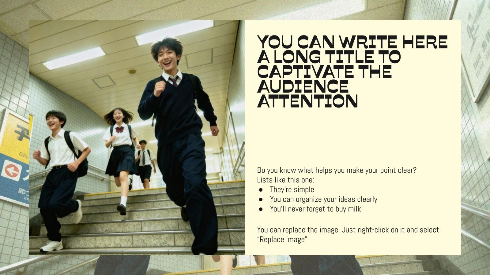下载《日本高中生活》演示文稿,用于PowerPoint或Google幻灯片。高中生正接近成年,因此该模板的设计反映了他们教育的成熟性。定制明确的章节,整合多媒体和互动元素,并为研究或小组项目留出空间——这个引人入胜且有效的Google幻灯片主题和PowerPoint模板的可能性是无限的。下载此设计,提供逻辑且有条理的结构,实现信息流畅。