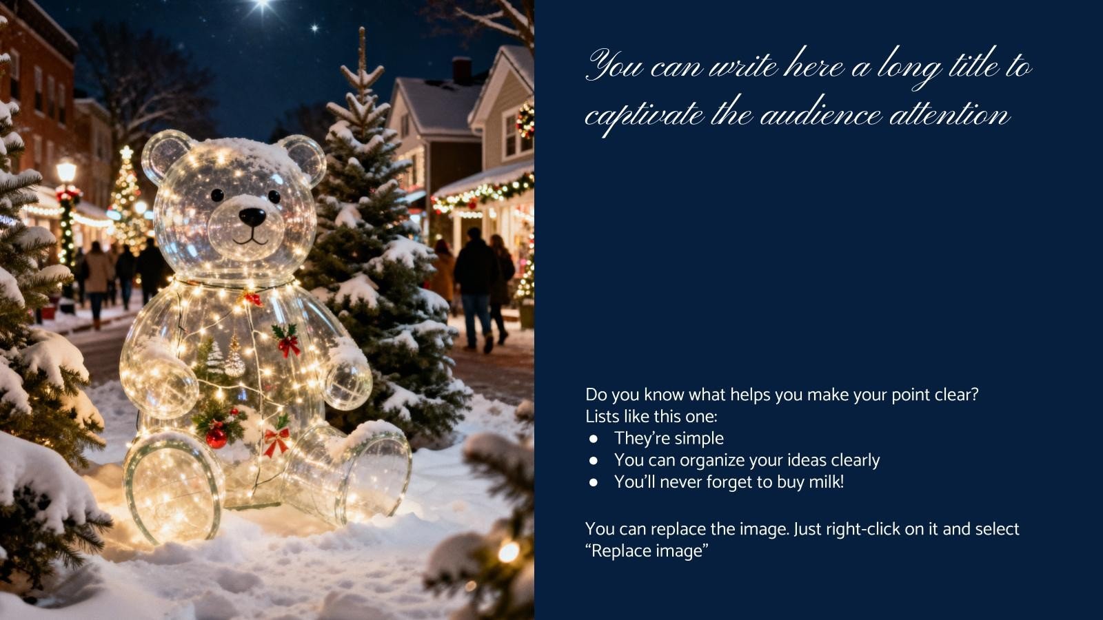 “下载圣诞灯光演示文稿,支持PowerPoint或Google幻灯片,开始用创意和原创的设计打动你的观众。像这里这样的幻灯片模板,可以通过不同的图形资源,以清晰、简洁和直观的方式传达一个概念、想法或主题。你需要谈论一个具体话题,但你不知道怎么说?试试用像这里这样的演示,百分之百可定制!”