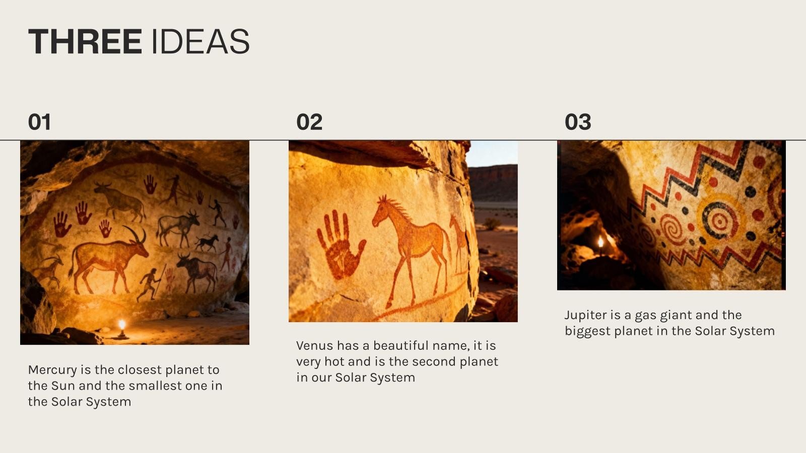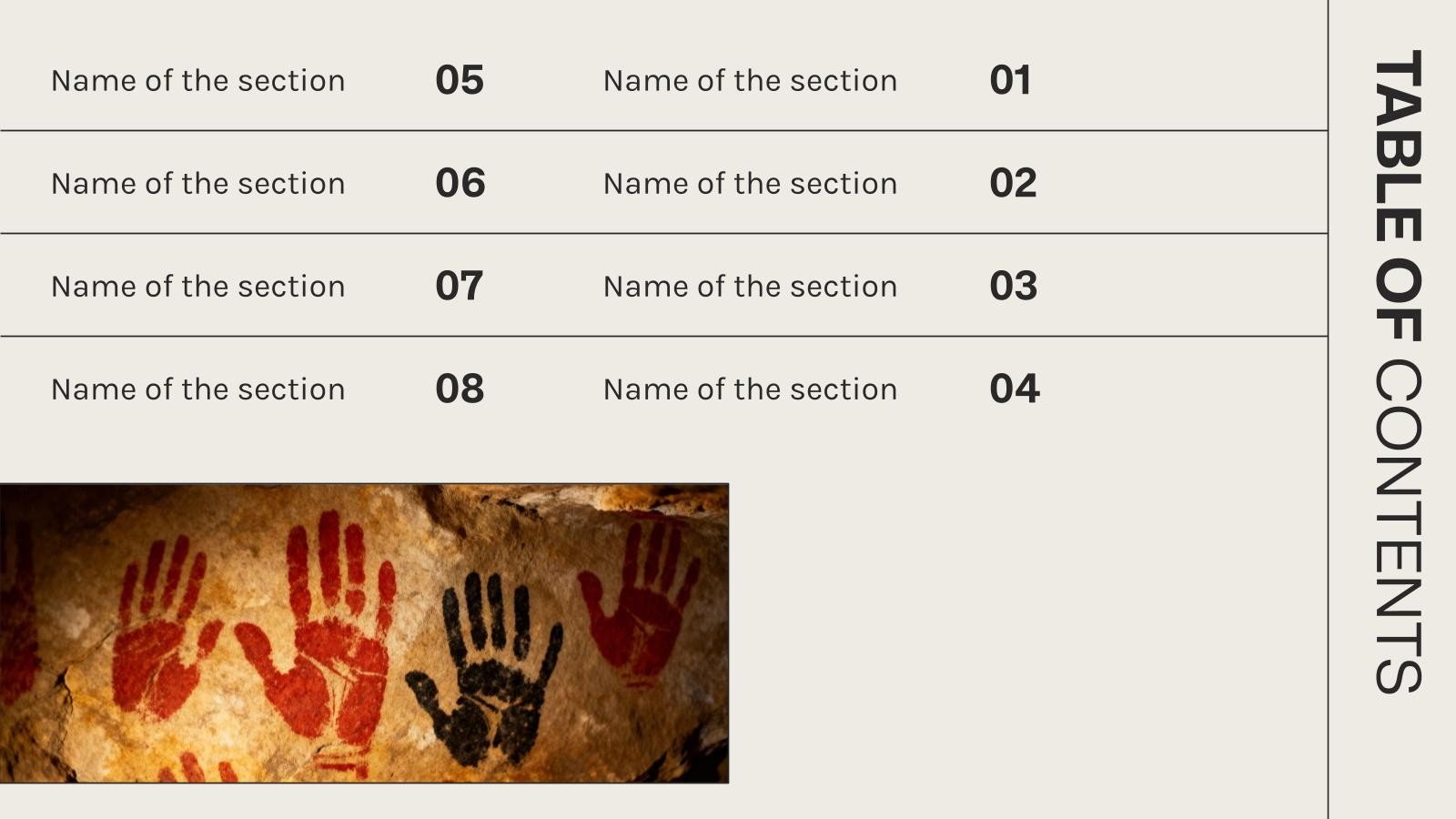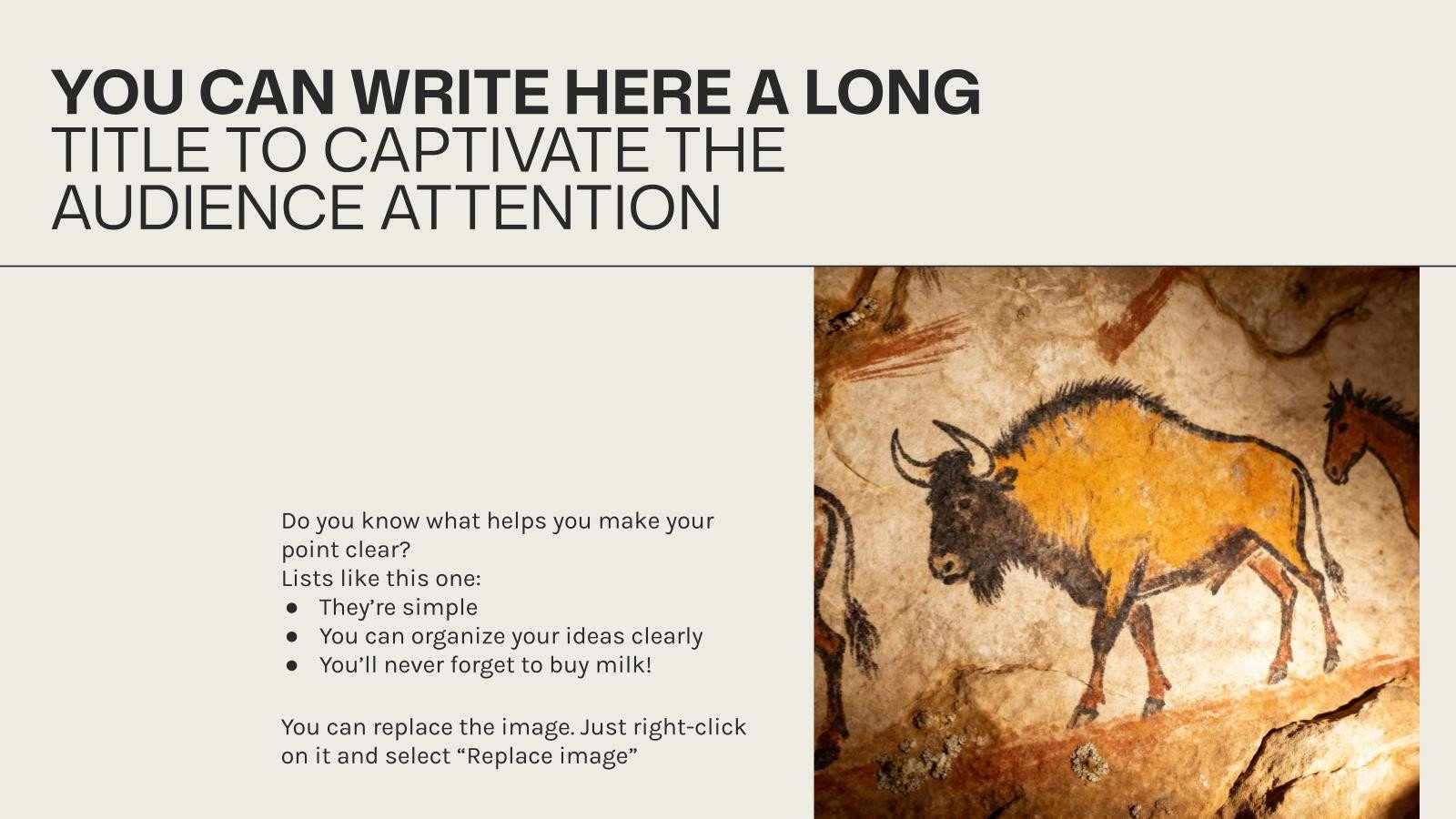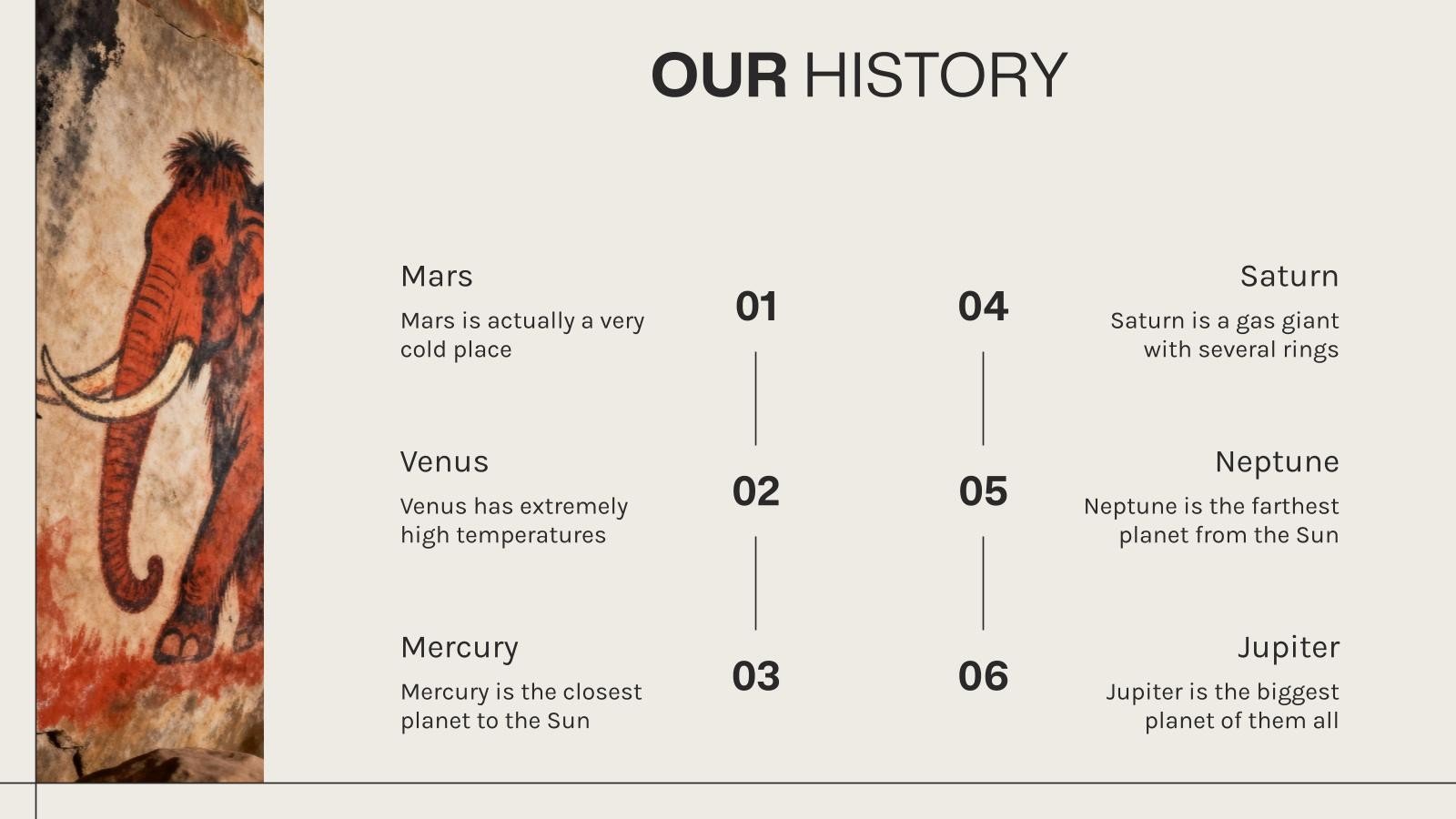 “下载洞穴壁画历史演示文稿,支持PowerPoint或Google幻灯片,开始用创意和原创的设计打动你的听众。像这里这样的幻灯片模板,可以通过不同的图形资源,以清晰、简洁和直观的方式传达一个概念、想法或主题。你需要谈论一个具体话题,但你不知道怎么说?试试用像这里这样的演示,百分之百可定制!”