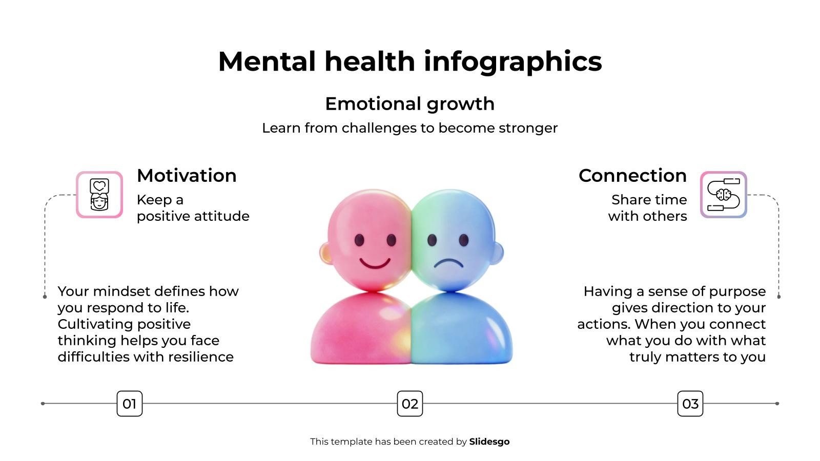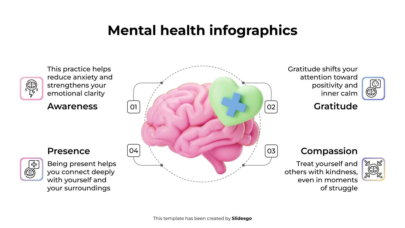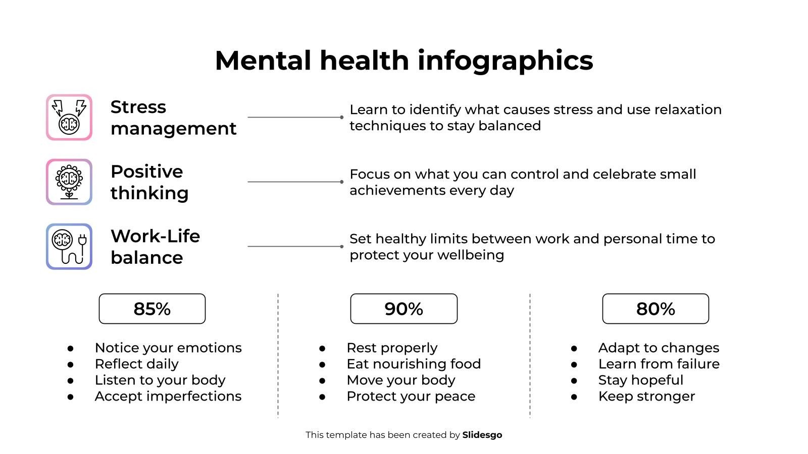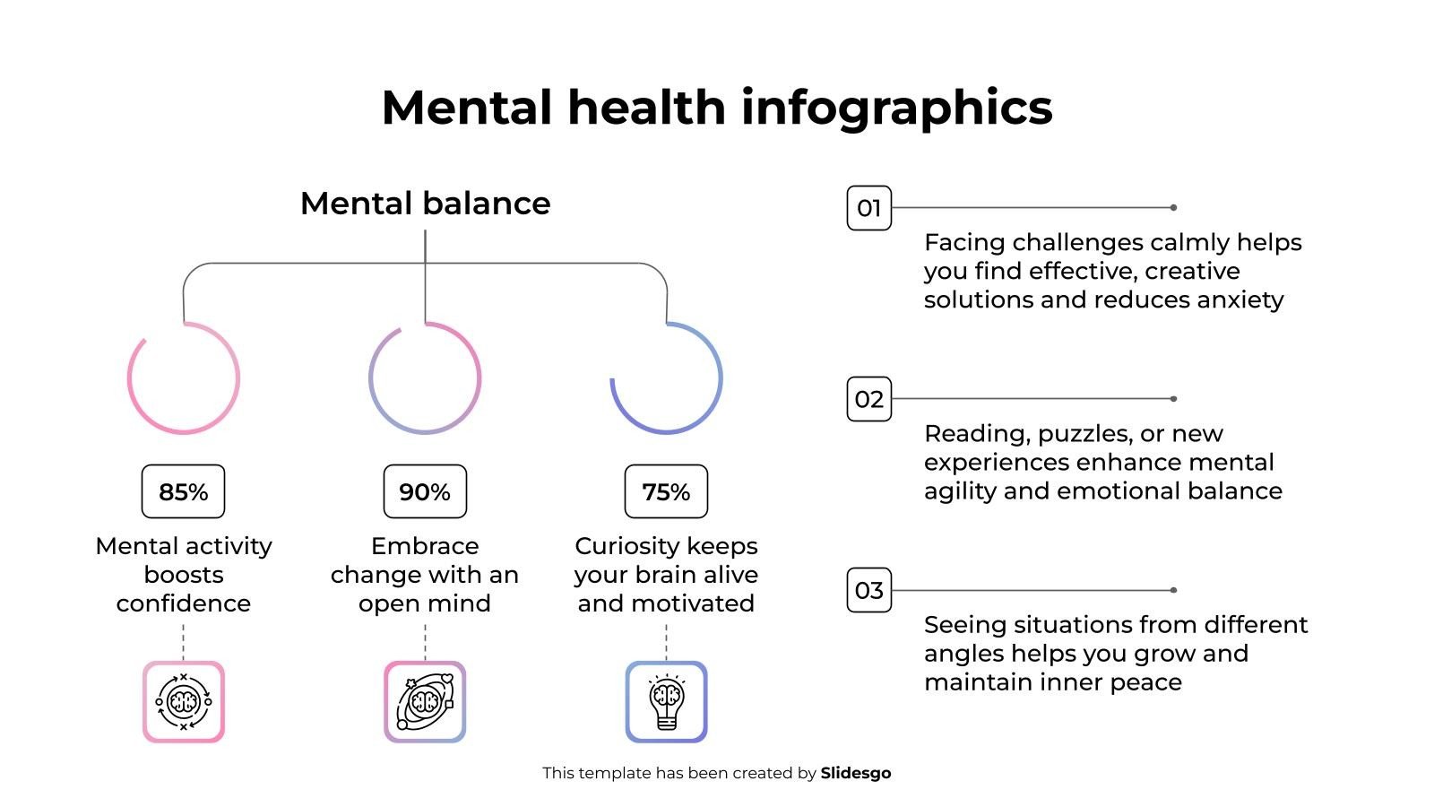“下载心理健康信息图表模板,适用于PowerPoint或Google幻灯片。当需要制作医学主题的演讲时,问题随之而来。我能传达出一个复杂的医学概念吗?多亏了这个带有医疗演示信息图资源的模板,这种担忧将不复存在。在演示中使用你最喜欢的信息图表,定制它们,获得完美的效果。”
