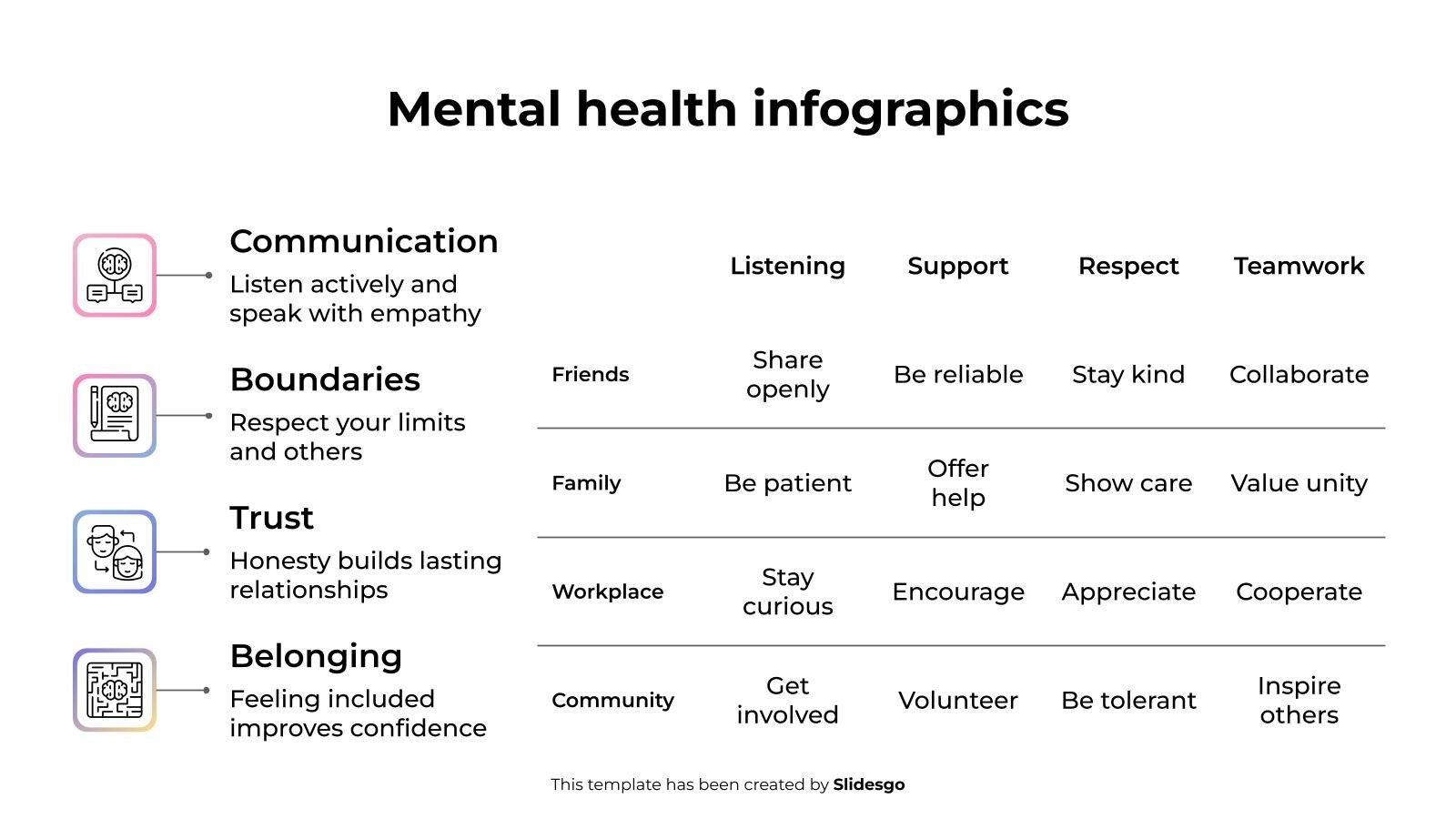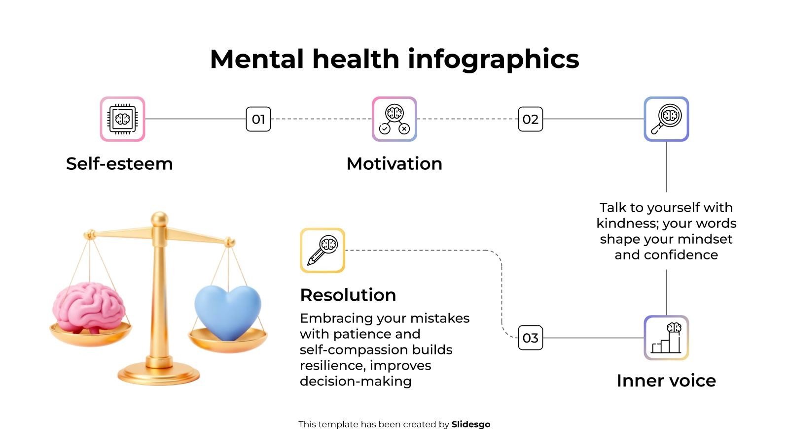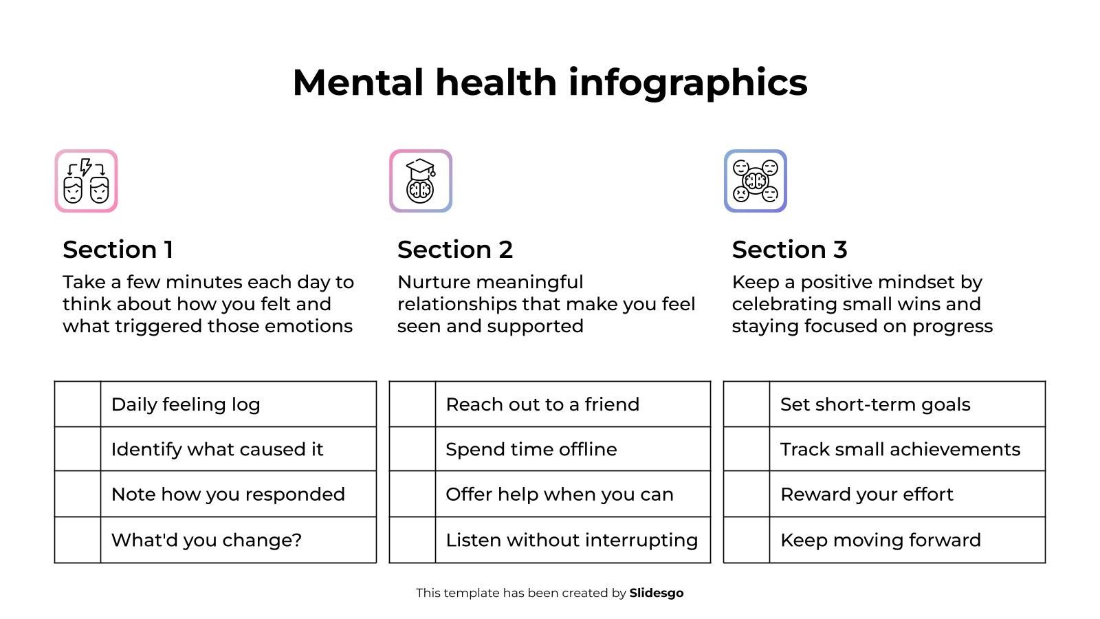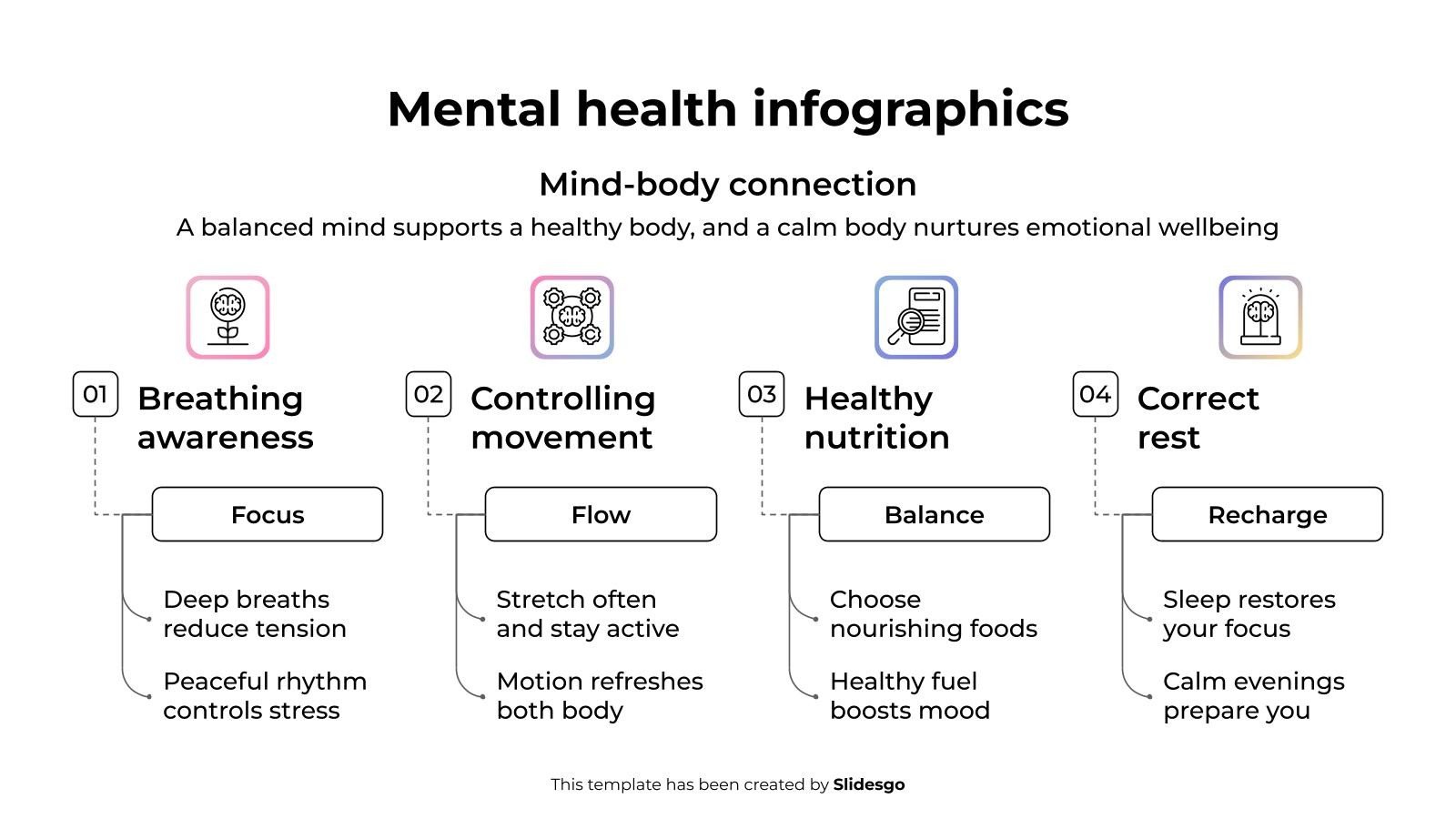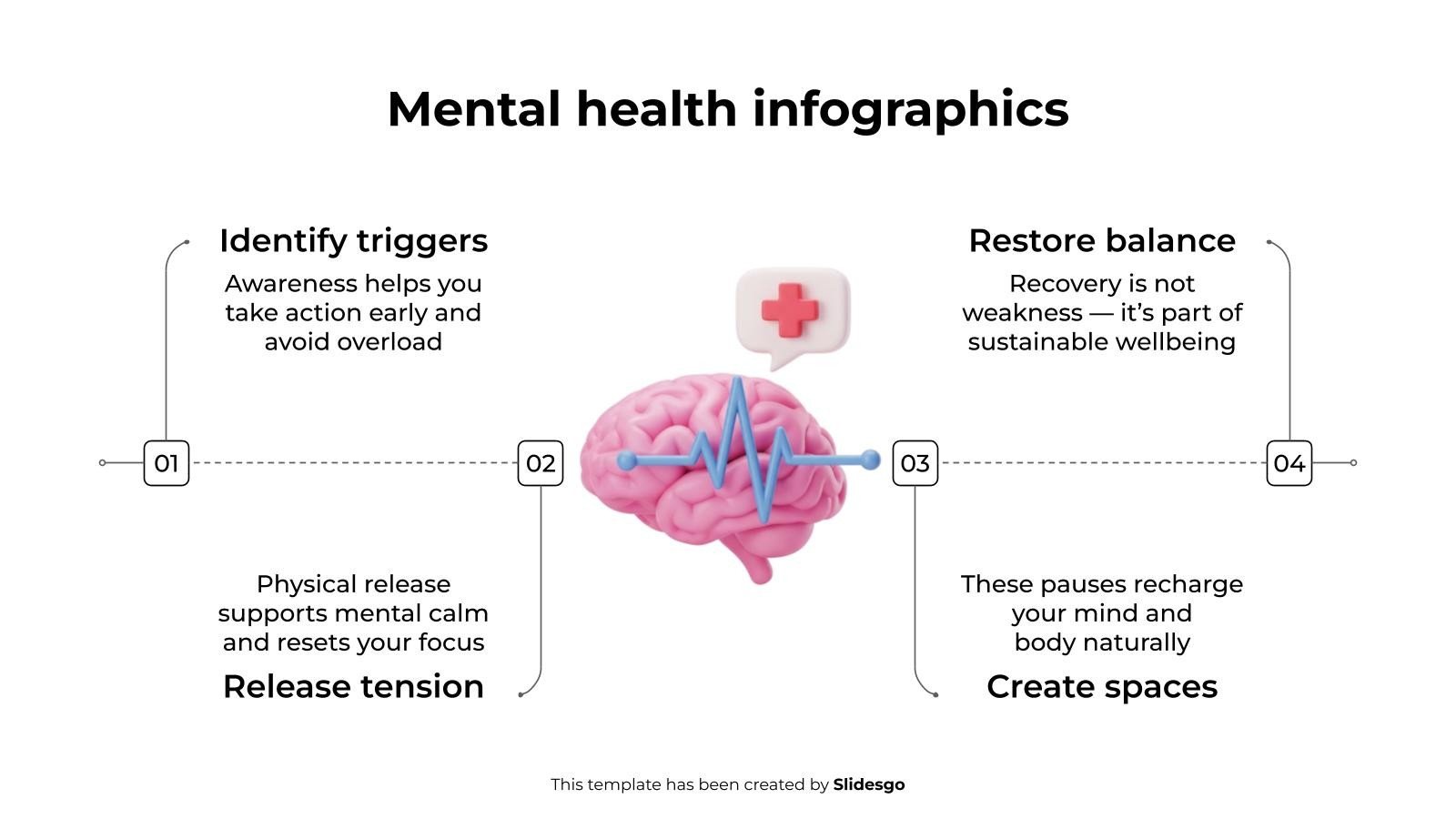 “下载心理健康信息图表模板,适用于PowerPoint或Google幻灯片。当需要制作医学主题的演讲时,问题随之而来。我能传达出一个复杂的医学概念吗?多亏了这个带有医疗演示信息图资源的模板,这种担忧将不复存在。在演示中使用你最喜欢的信息图表,定制它们,获得完美的效果。”
