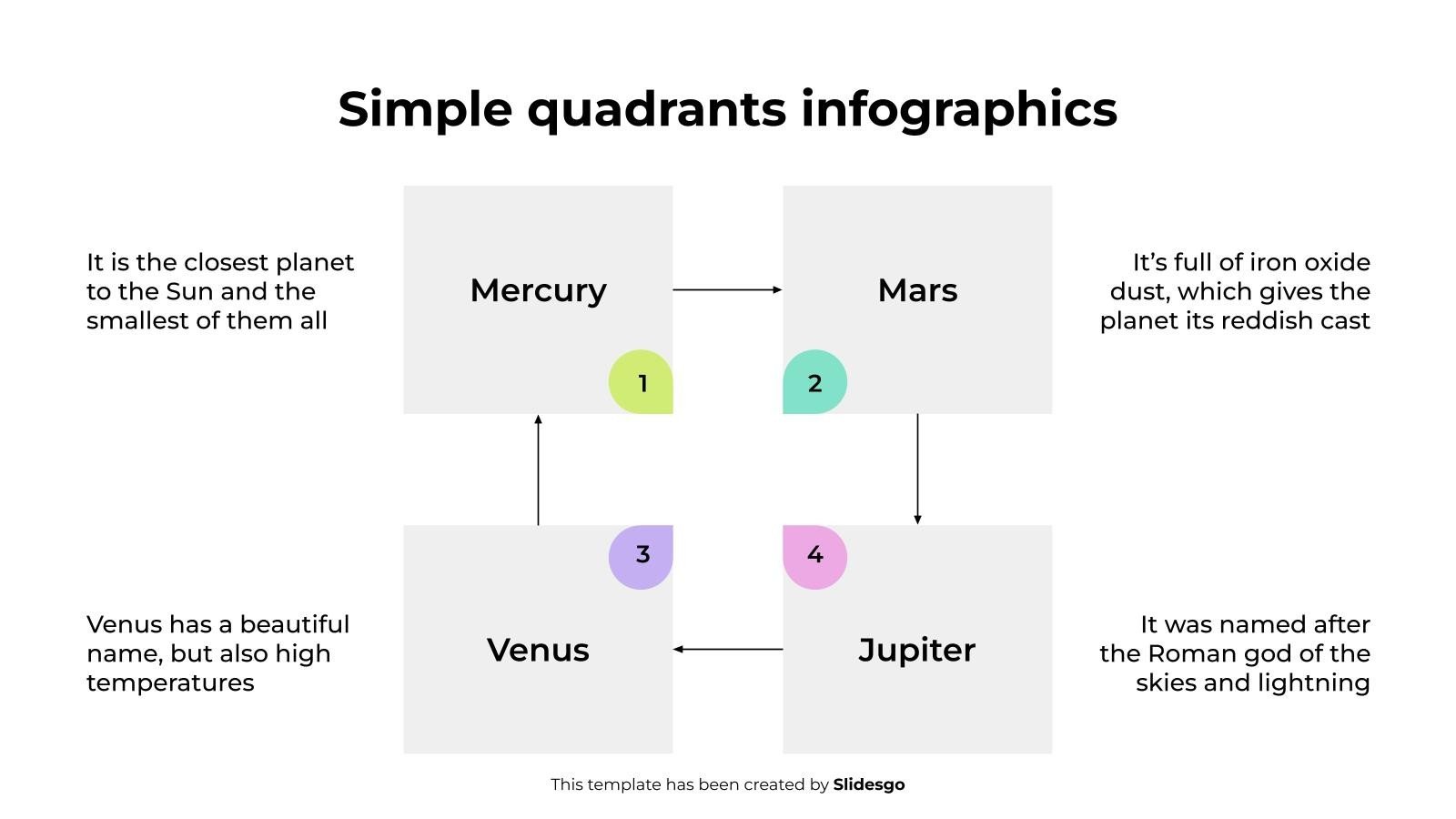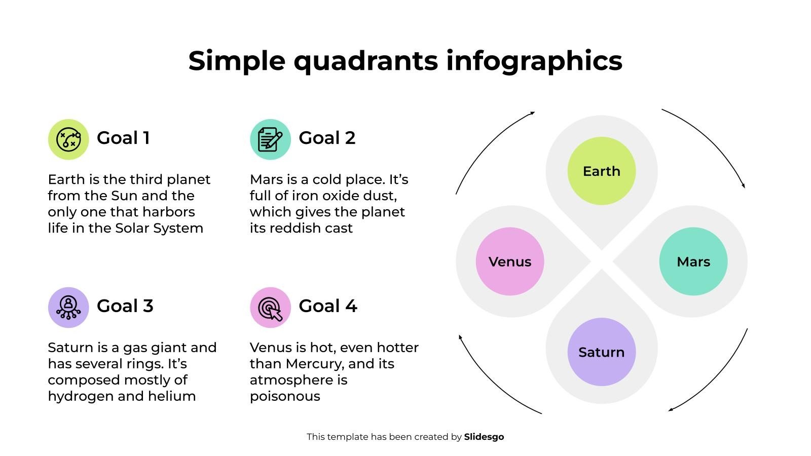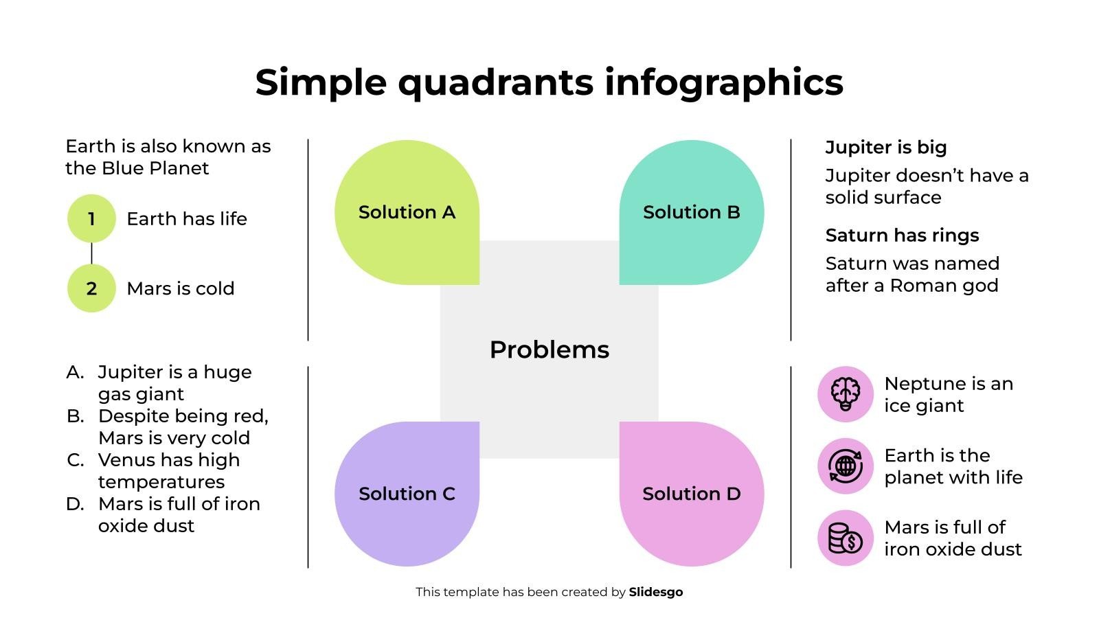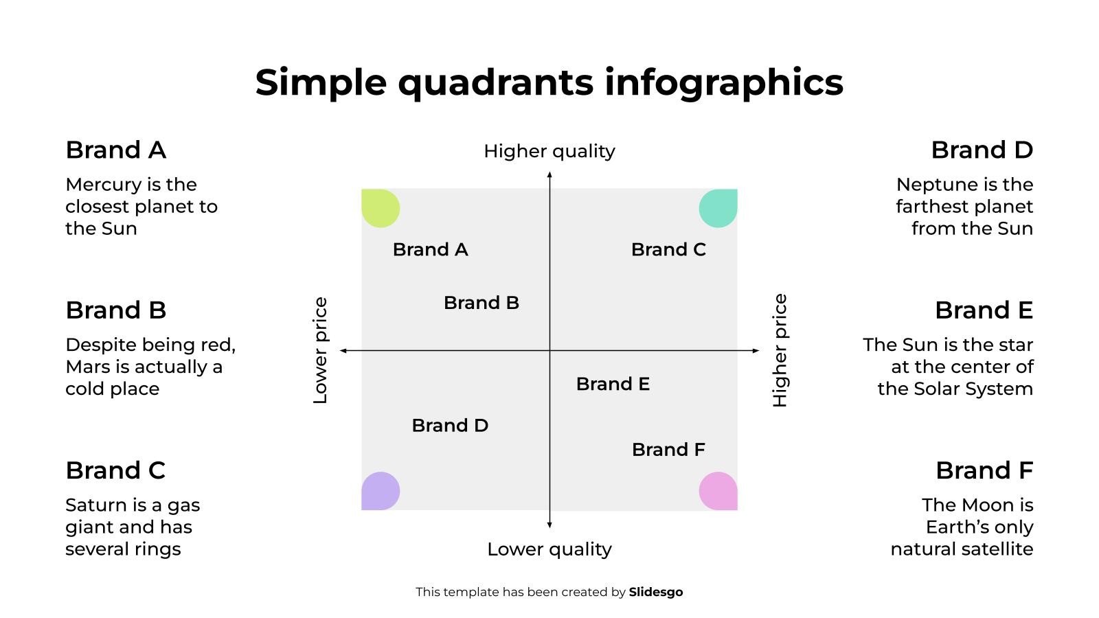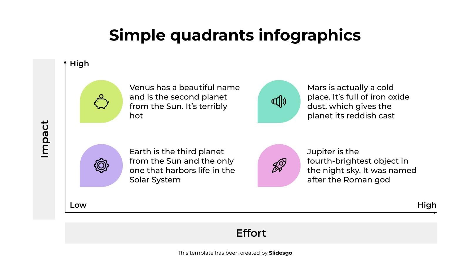 下载Simple Quadrants信息图表模板,适用于PowerPoint或Google幻灯片,充分利用信息图表。无论你想用表格整理你的企业预算,还是对过去一年的销售进行示意性分析,这套信息图资源都会非常有帮助。现在就开始使用信息图表,将你的企业或营销演示提升到一个新高度。