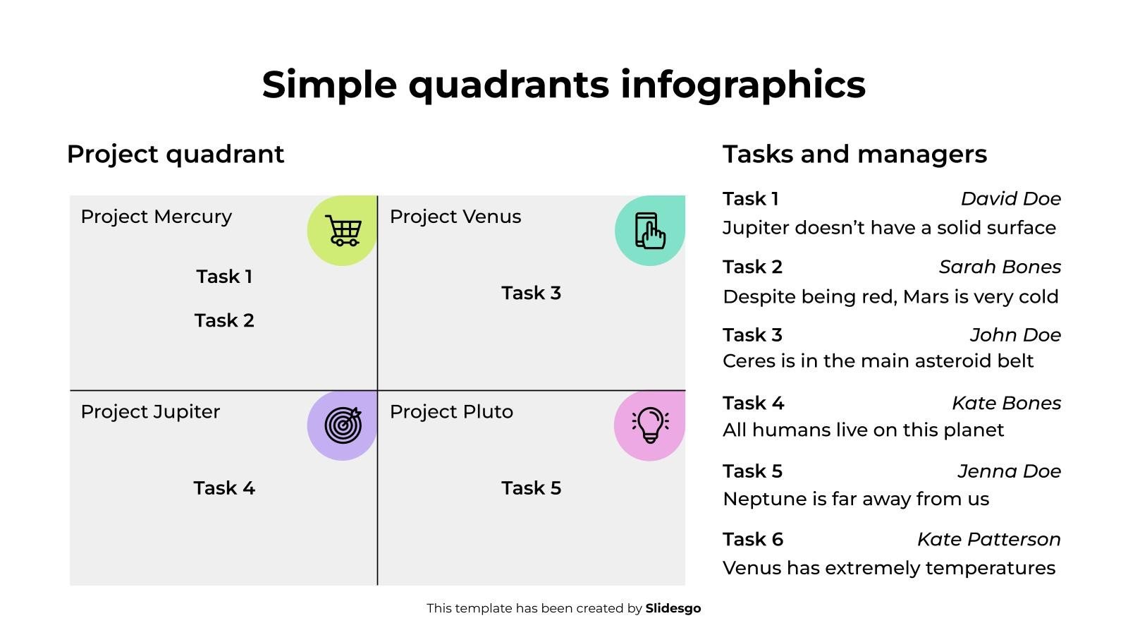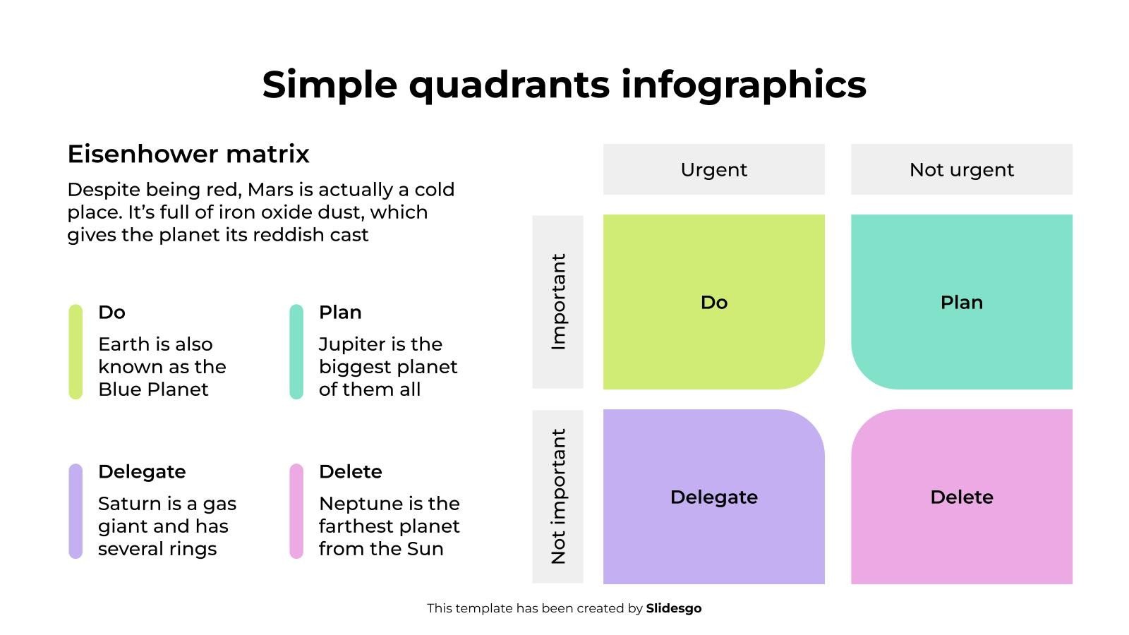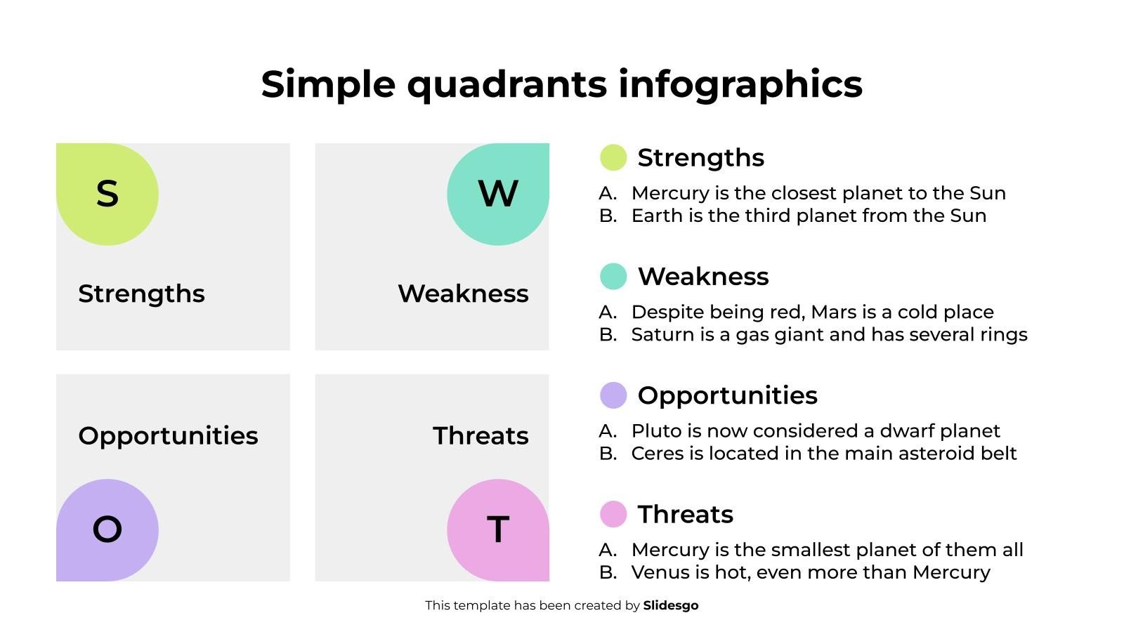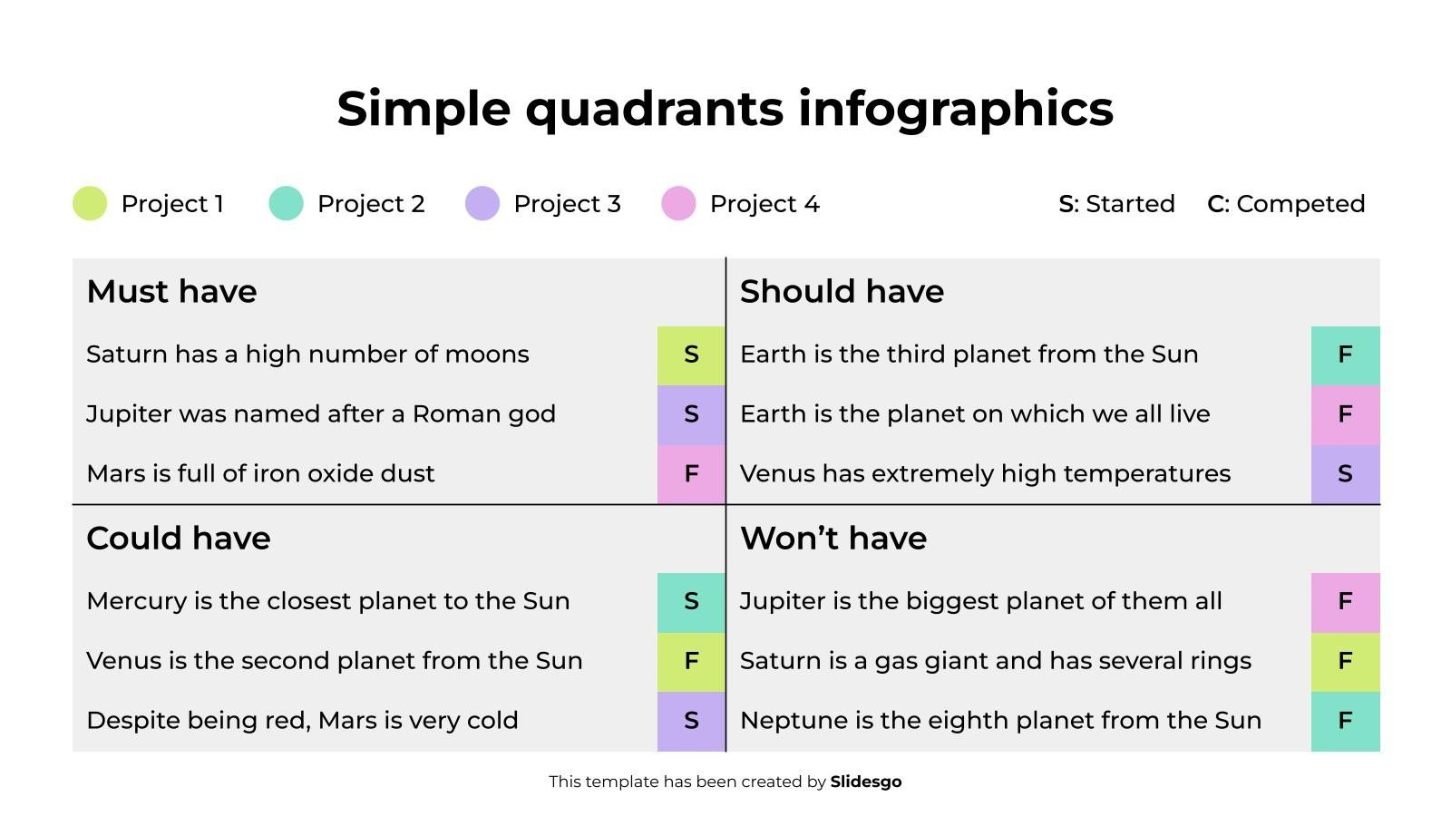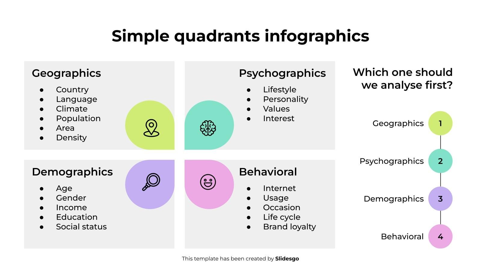 下载Simple Quadrants信息图表模板,适用于PowerPoint或Google幻灯片,充分利用信息图表。无论你想用表格整理你的企业预算,还是对过去一年的销售进行示意性分析,这套信息图资源都会非常有帮助。现在就开始使用信息图表,将你的企业或营销演示提升到一个新高度。