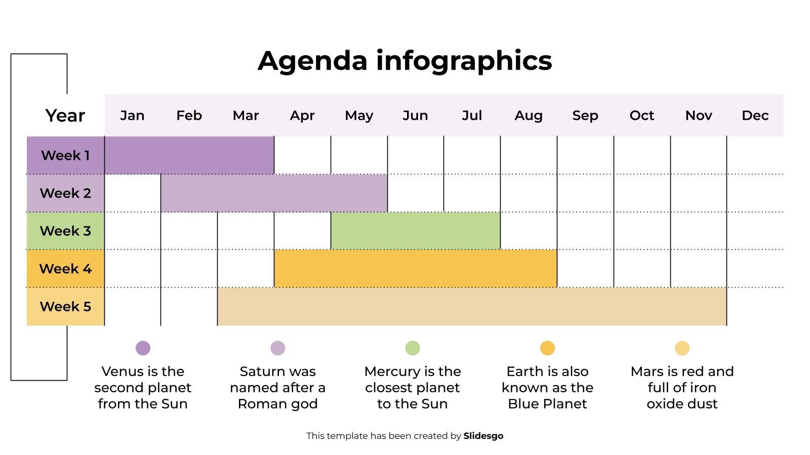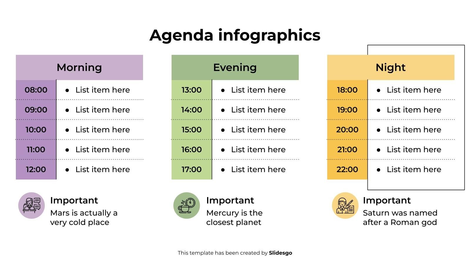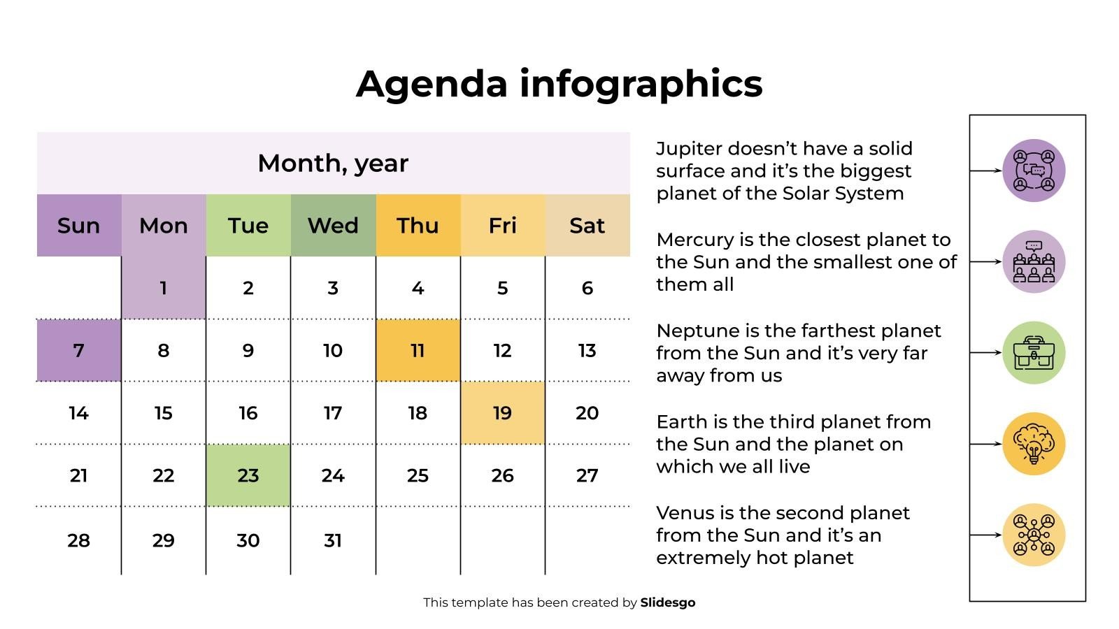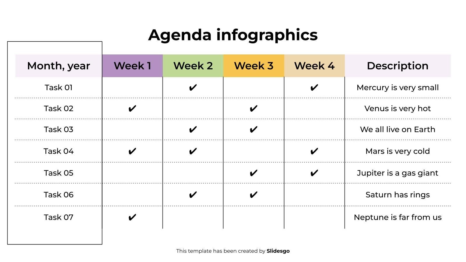 下载 Agenda 信息图表模板,适用于 PowerPoint 或 Google 幻灯片,以充分利用信息图表。无论你想用表格整理你的企业预算,还是对过去一年的销售进行示意性分析,这套信息图资源都会非常有帮助。现在就开始使用信息图表,将你的企业或营销演示提升到一个新高度。