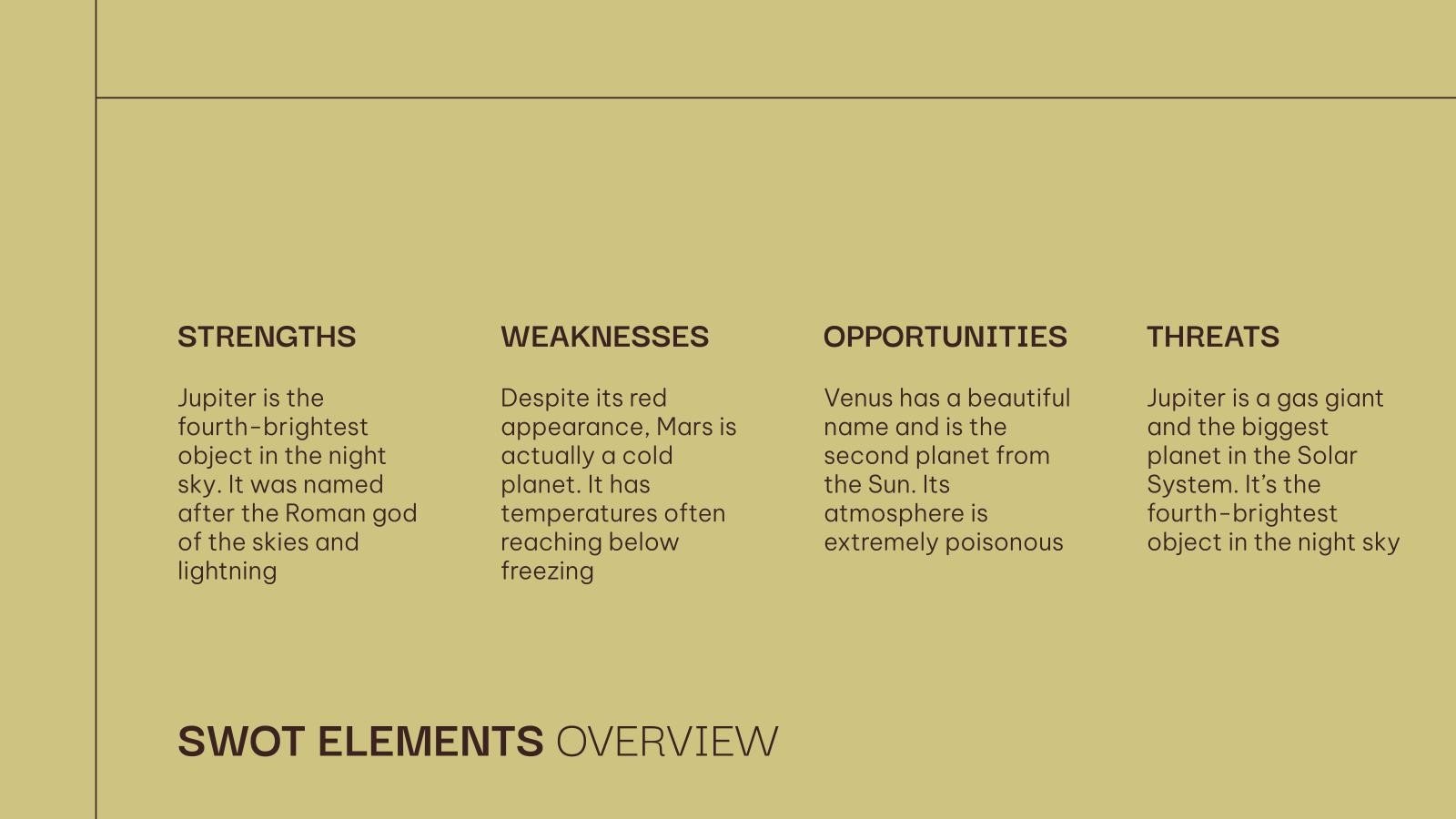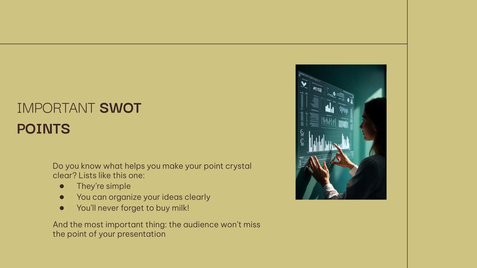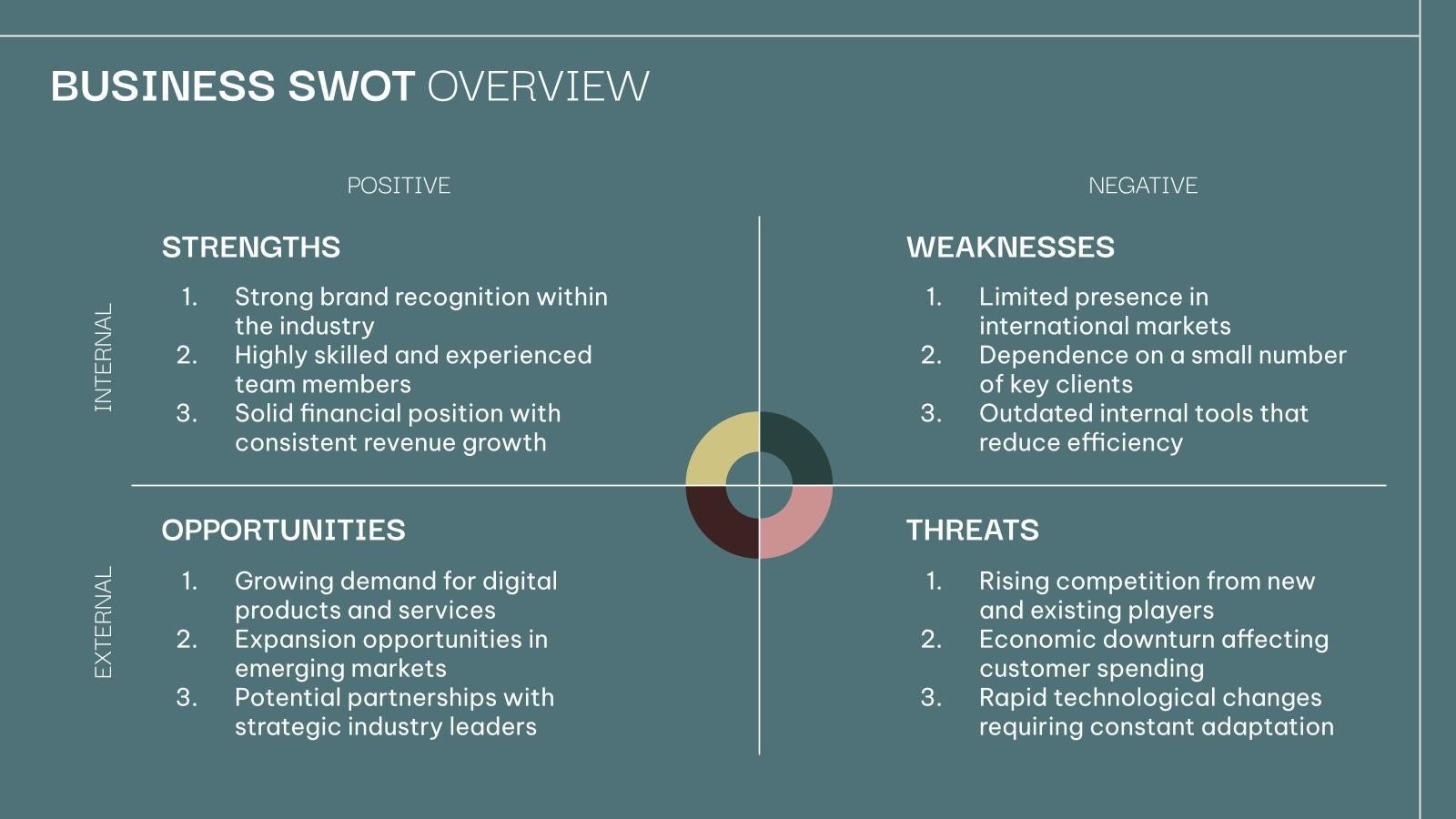 “下载 SWOT 分析演示文稿,支持 PowerPoint 或 Google 幻灯片,开始用创意和原创设计打动你的听众。像这里这样的幻灯片模板,可以通过不同的图形资源,以清晰、简洁和直观的方式传达一个概念、想法或主题。你需要谈论一个具体话题,但你不知道怎么说?试试用像这里这样的演示,百分之百可定制!”