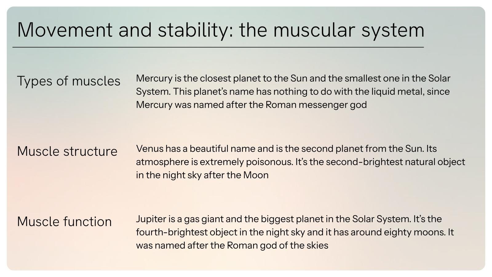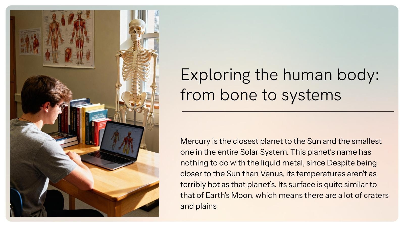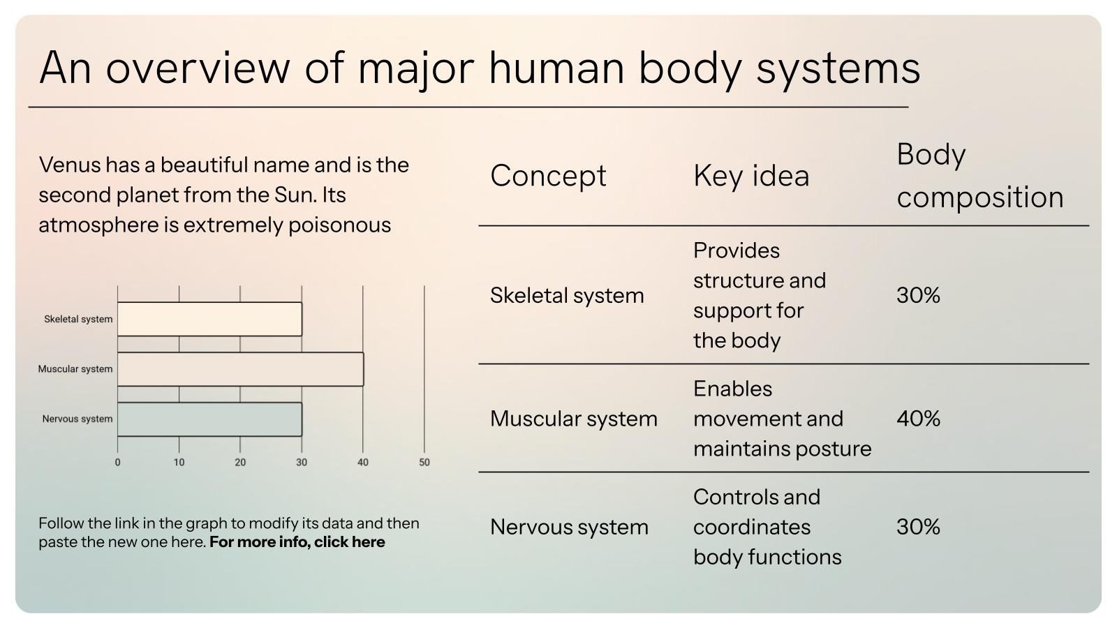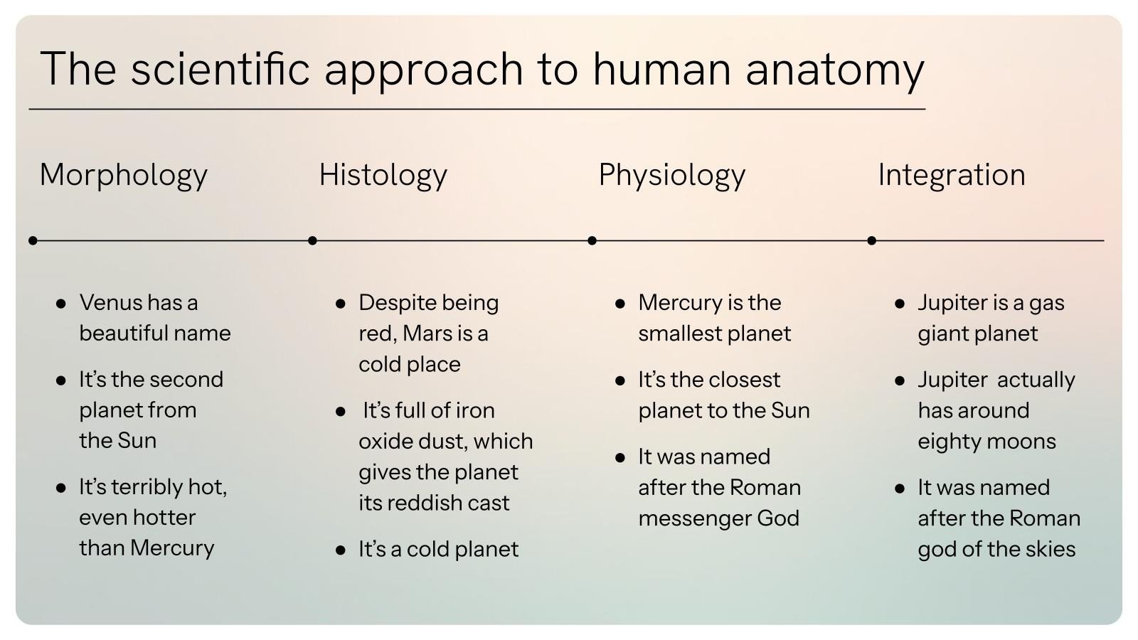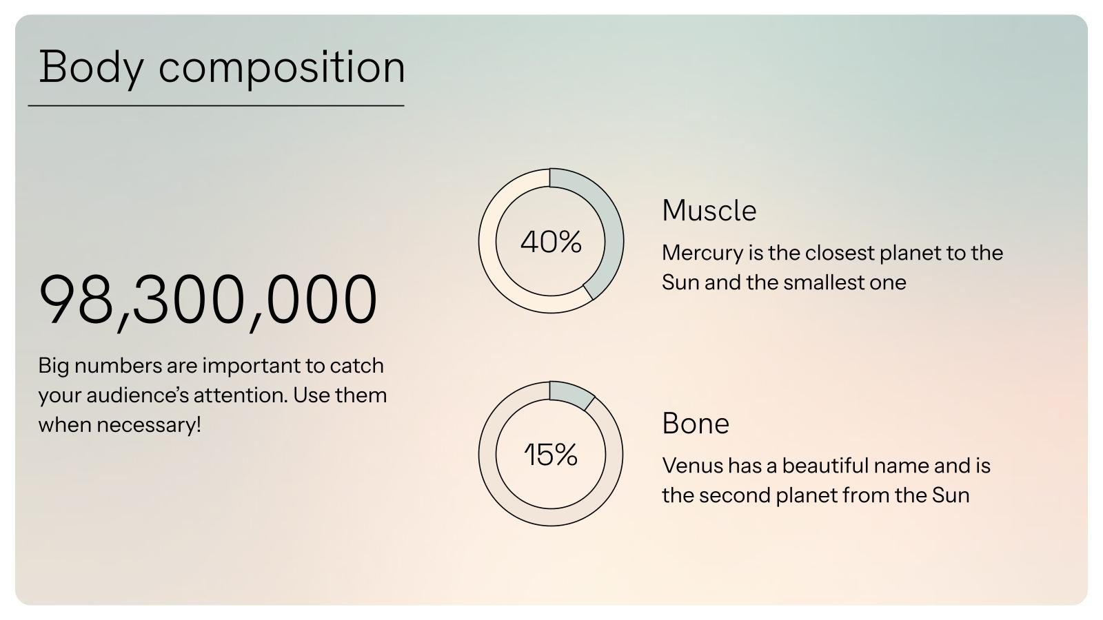 “下载适用于 PowerPoint 或 Google 幻灯片的解剖学基础知识演示文稿,并开始用创意和原创设计给观众留下深刻印象。像这里这样的 Slidesgo 模板提供了通过使用不同的图形资源以清晰、简洁和直观的方式传达概念、想法或主题的可能性。你需要谈论一个特定的话题,但你不知道该怎么做?尝试使用像这样的演示文稿,100% 可定制!