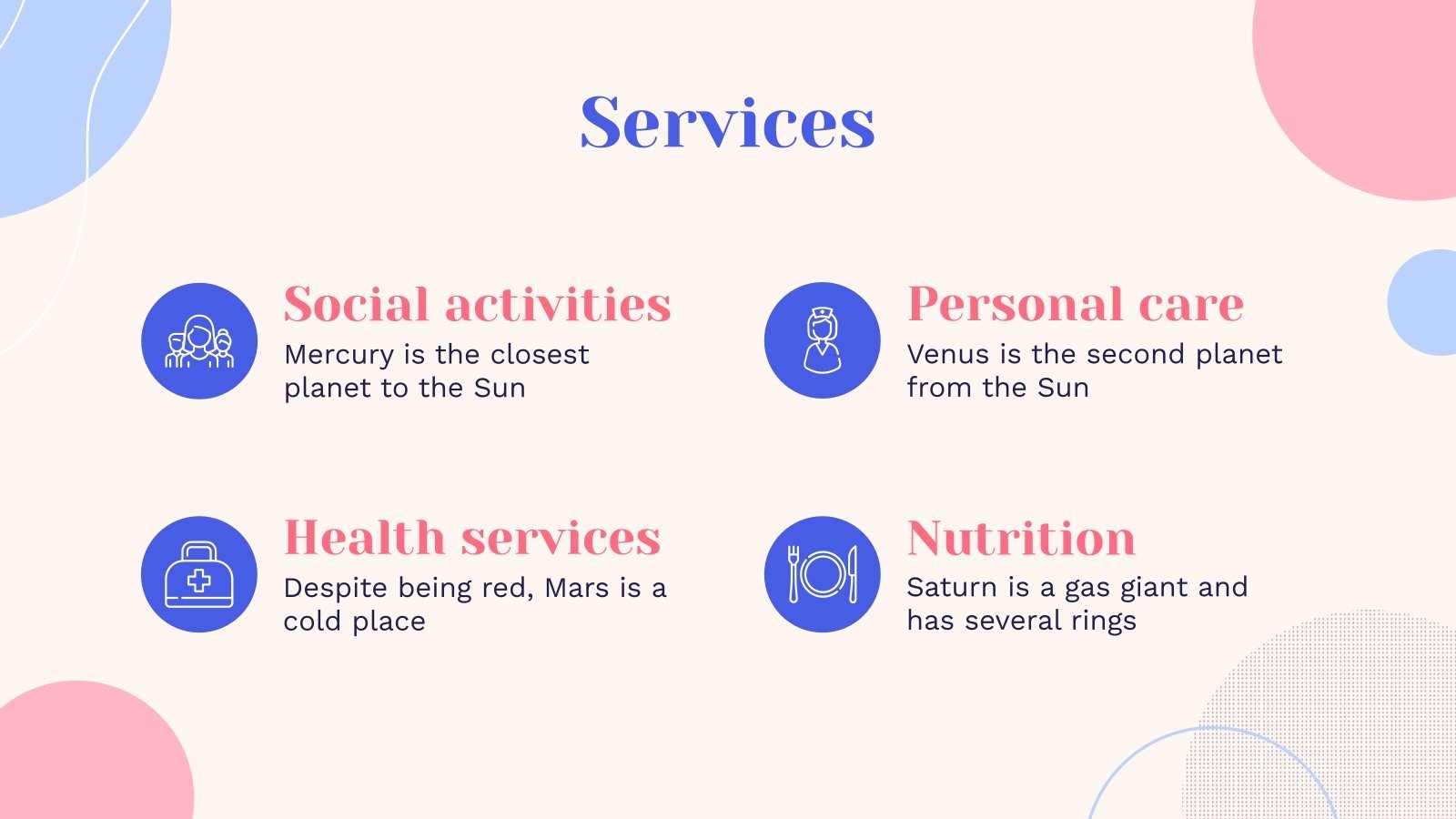 下载成人日托中心演示文稿以获取 PowerPoint 或 Google 幻灯片。医院、私人诊所、特定病房,您知道需要医疗护理时该去哪里。也许有一家专门治疗某些问题的诊所,或者您所在地区的一家以其最先进的技术而闻名的医院。尝试一下这个可编辑的 Google 幻灯片主题和 PowerPoint 模板来宣传您工作的医疗中心提供的服务怎么样?