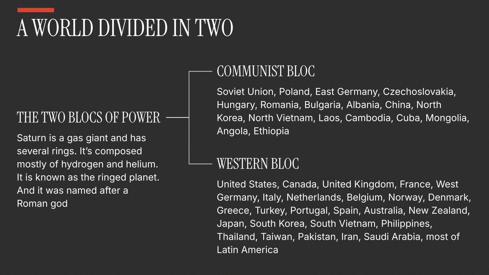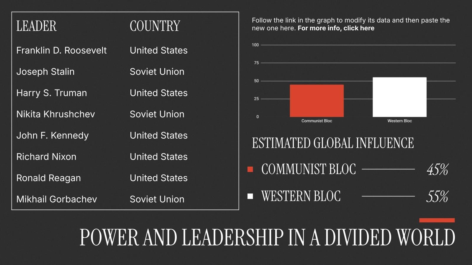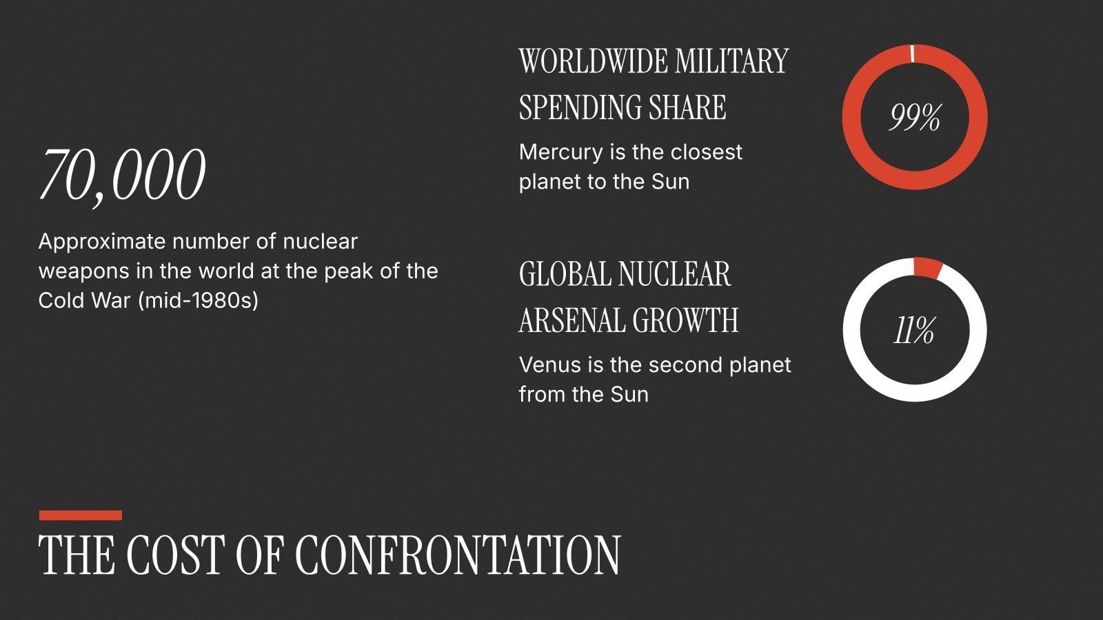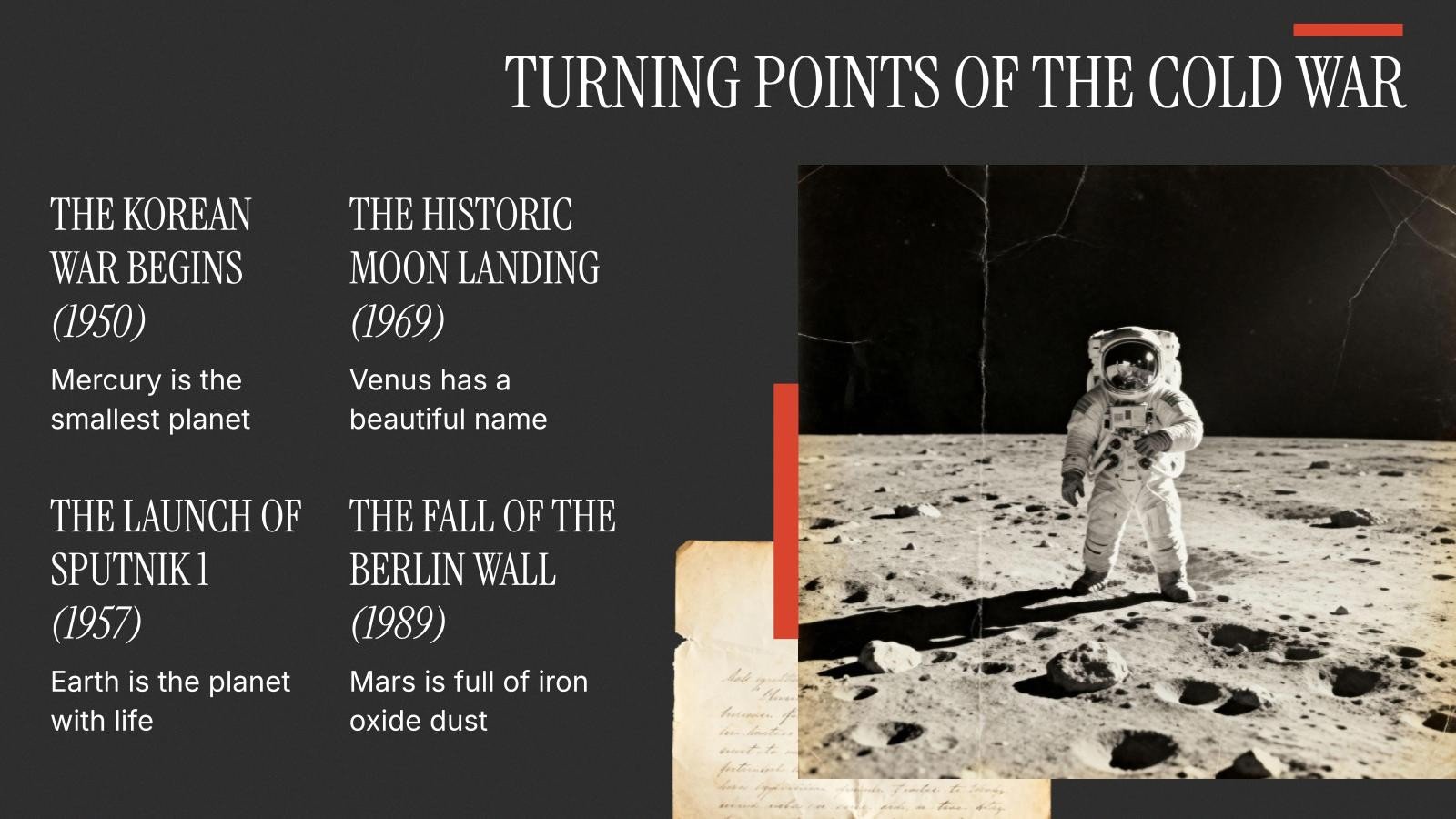 “下载 PowerPoint 或 Google 幻灯片的冷战演示文稿,开始用创意和原创设计给观众留下深刻印象。像这里这样的 Slidesgo 模板提供了通过使用不同的图形资源以清晰、简洁和直观的方式传达概念、想法或主题的可能性。你需要谈论一个特定的话题,但你不知道该怎么做?尝试使用像这样的演示文稿,100% 可定制!