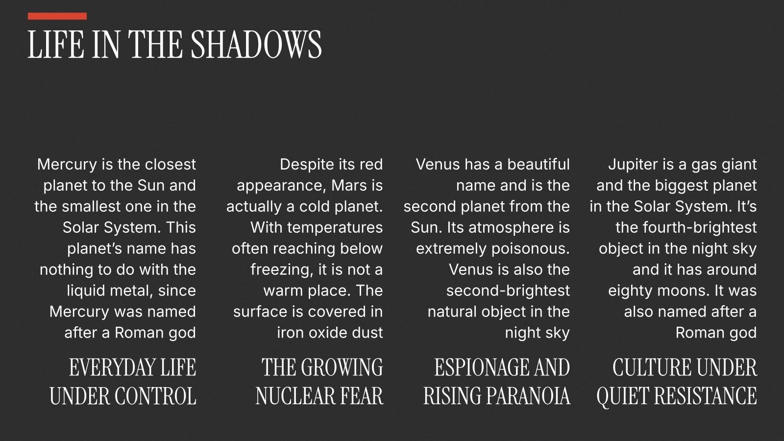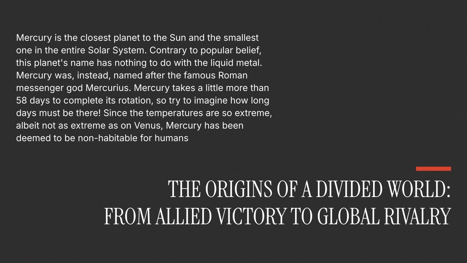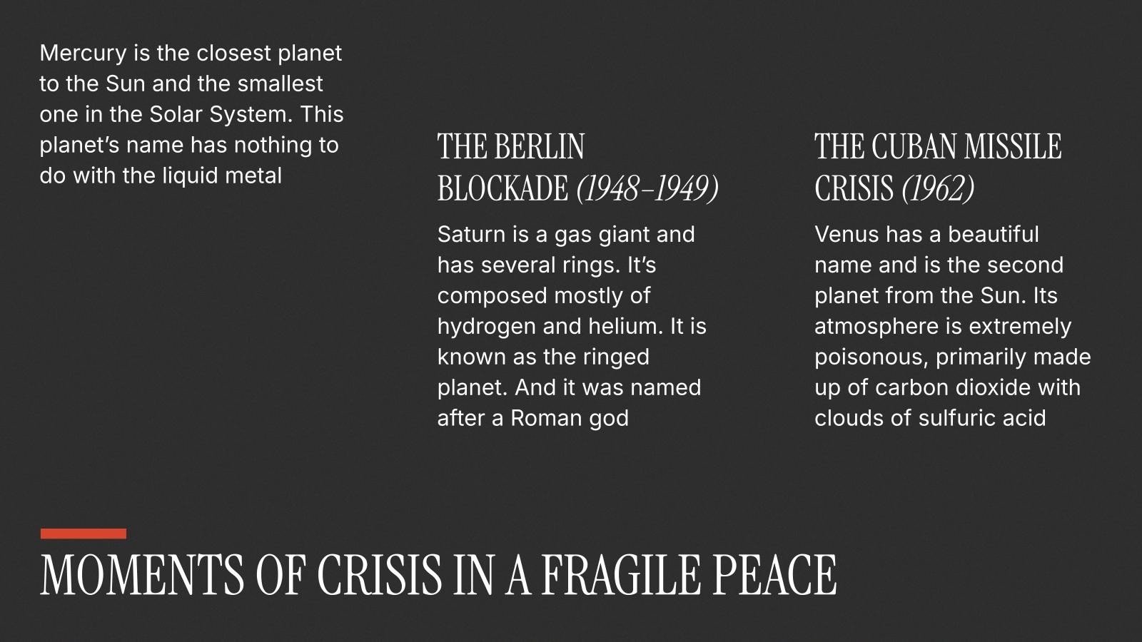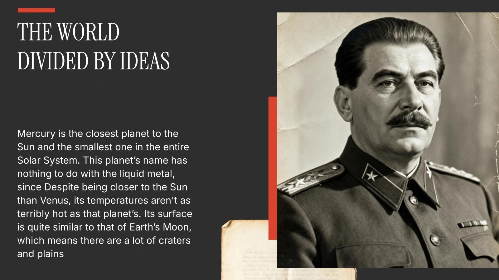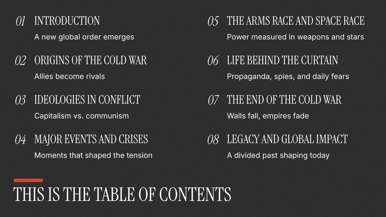“下载 PowerPoint 或 Google 幻灯片的冷战演示文稿,开始用创意和原创设计给观众留下深刻印象。像这里这样的 Slidesgo 模板提供了通过使用不同的图形资源以清晰、简洁和直观的方式传达概念、想法或主题的可能性。你需要谈论一个特定的话题,但你不知道该怎么做?尝试使用像这样的演示文稿,100% 可定制!